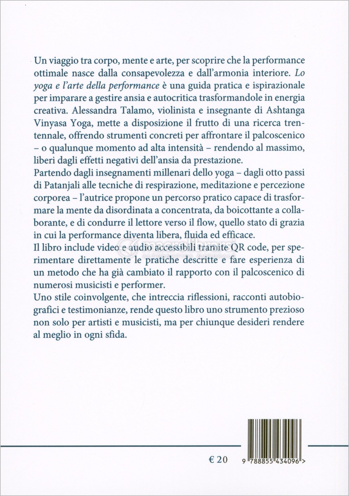 Alessandra Talamo, violinista e insegnante di Ashtanga Vinyasa Yoga, mette a disposizione il frutto di una ricerca trentennale, offrendo strumenti concreti per affrontare il palcoscenico – o qualunque momento ad alta intensità – rendendo al massimo, liberi dagli effetti negativi dell’ansia da prestazione.
