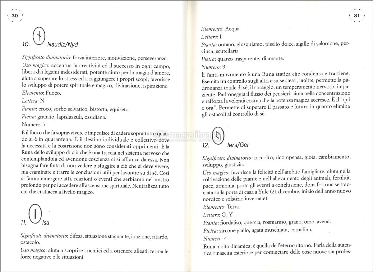 Purtroppo durante la lettura salta all'occhio una traduzione non molto felice. In alcuni punti si ha l'impressione che sia stato utilizzato un traduttore. Punto a favore: Il libro fisico e' ottimo in quanto la rilegatura e' a filo, e sono pochi gli editori che la utilizzano ancora. Altro punto a sfavore sono le immagini delle rune che a volte sembrano sgranate. Per il contenuto del libro, a parte alcuni paragrafi che trattano di incantesimi in lingua che, secondo me, hanno poco valore pratico, e' abbastanza buono. Viene descritta molto bene la consacrazione delle bindrunes e alla fine vi e' un ottimo capitolo che descrive l'utilizzo delle rune con le candele, molto bello e utile.
