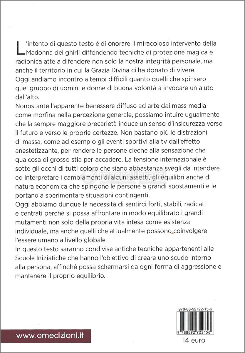 L’intento di questo testo è di onorare il miracoloso intervento della Madonna dei ghirli diffondendo tecniche di protezione magica e radionica atte a difendere non solo la nostra integrità personale, ma anche il territorio in cui la Grazia Divina ci ha donato di vivere.