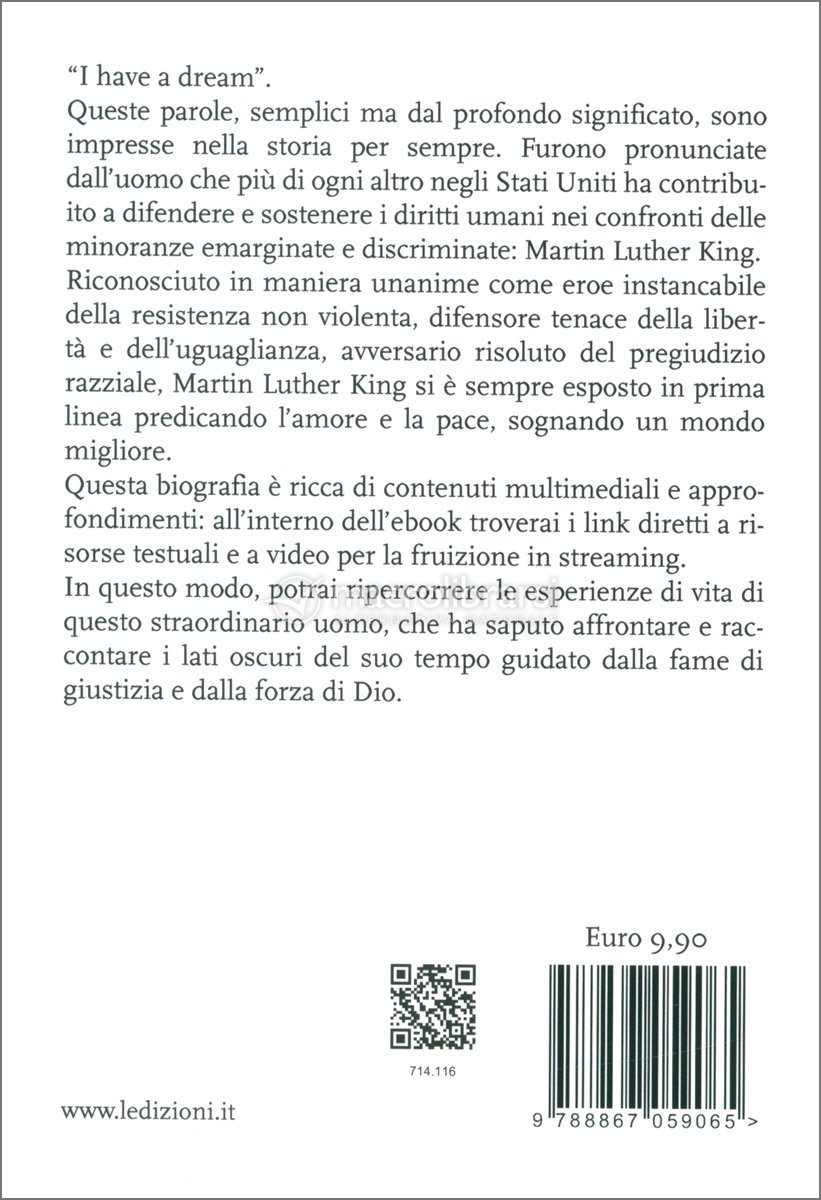 Riconosciuto in maniera unanime come eroe instancabile della resistenza non violenta, difensore tenace della libertà e dell’uguaglianza, avversario risoluto del pregiudizio razziale, Martin Luther King si è sempre esposto in prima linea predicando l’amore e la pace, sognando un mondo migliore.