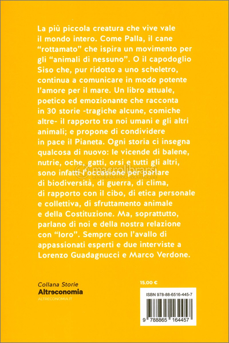In queste pagine si incontrano storie delicate e intensi drammi: i cavallucci di mare che abitano le acque vicine all’Ilva di Taranto; i tanti animali che donano un po’ di felicità a chi è in carcere o non ha una casa; le storie di fiducia reciproca e di pet therapy sociale; le migrazioni parallele di uomini e animali e le guerre, di cui anche altre specie subiscono le tristi conseguenze; la liberazione dalle “prigioni”, come i laboratori, i circhi, gli allevamenti intensivi.
