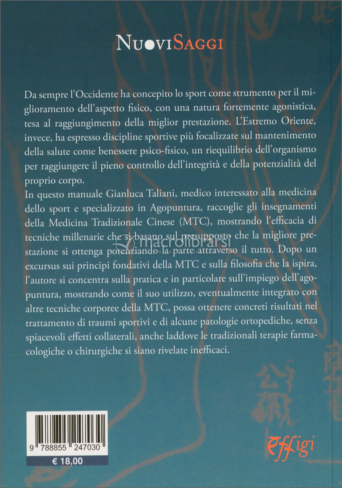 In questo manuale Gianluca Taliani, medico interessato alla medicina dello sport e specializzato in Agopuntura, raccoglie gli insegnamenti della Medicina Tradizionale Cinese (MTC), mostrando l’efficacia di tecniche millenarie che si basano sul presupposto che la migliore prestazione si ottenga potenziando la parte attraverso il tutto.