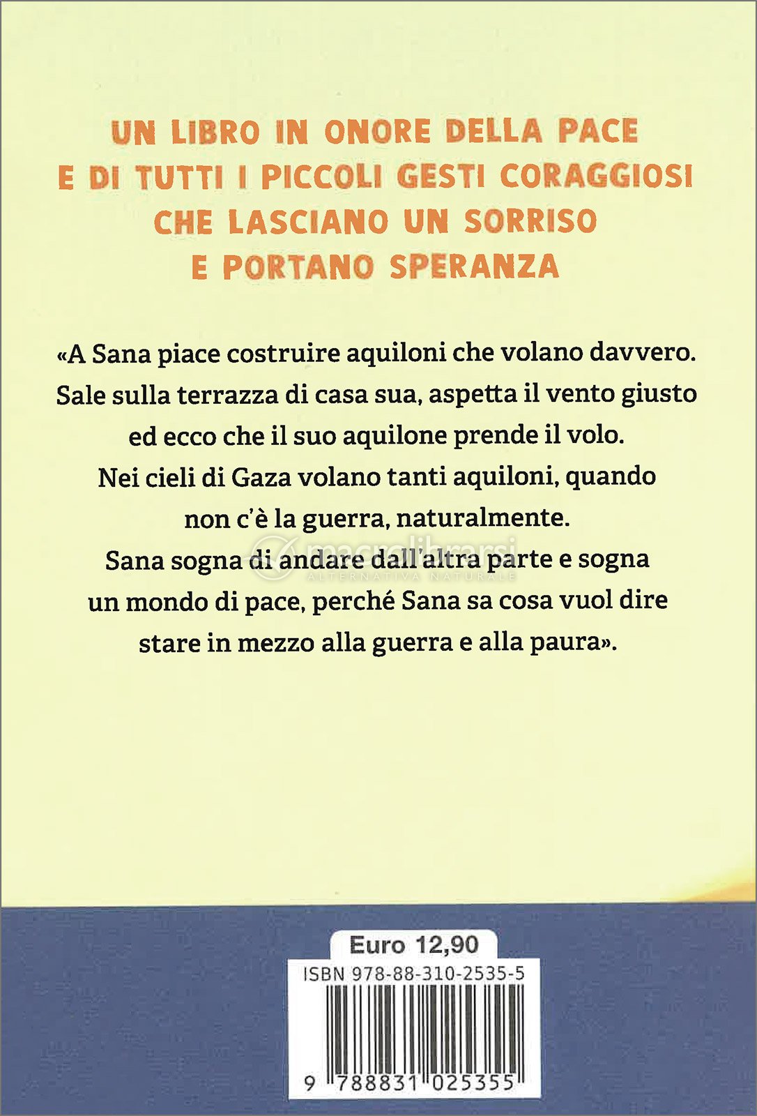 «A Sana piace costruire aquiloni che volano davvero. Sale sulla terrazza di casa sua, aspetta il vento giusto ed ecco che il suo aquilone prende il volo. Nei cieli di Gaza volano tanti aquiloni, quando non c’è la guerra, naturalmente. Sana sogna di andare dall’altra parte e sogna un mondo di pace, perché Sana sa cosa vuol dire stare in mezzo alla guerra e alla paura».
