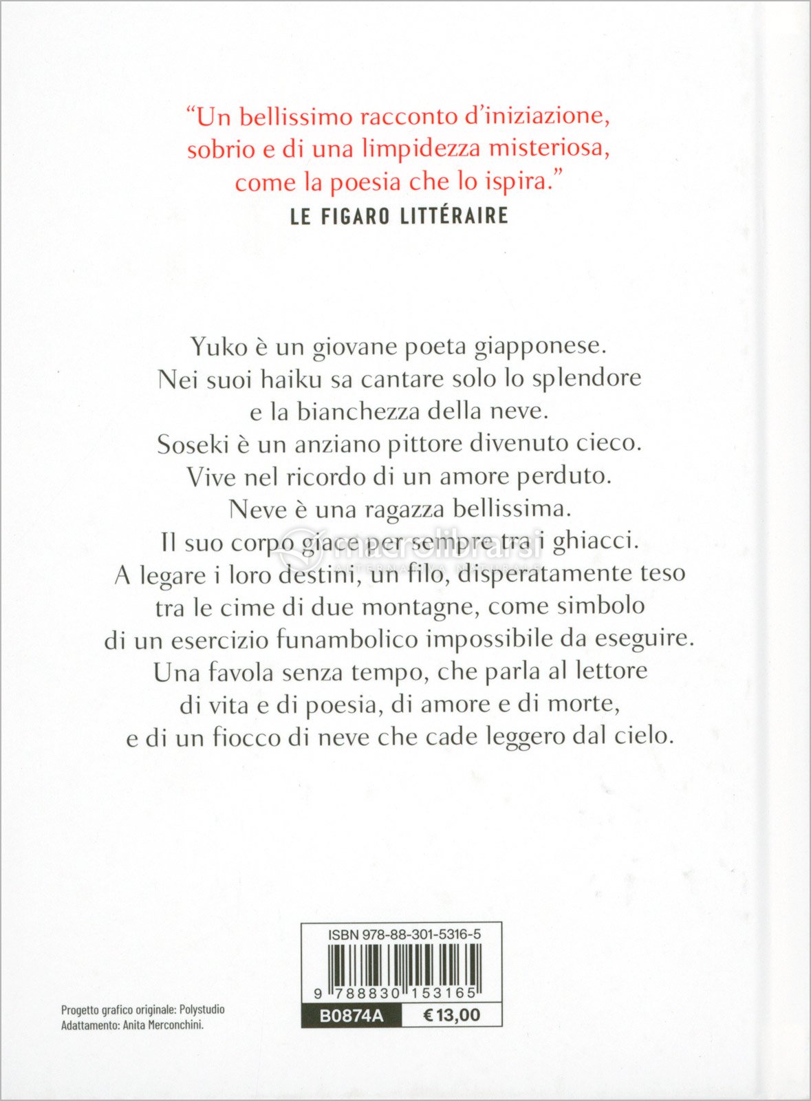 Neve è un racconto rarefatto e luminoso, un romanzo che si muove tra poesia e silenzio, evocando immagini essenziali come un haiku scritto sulla neve appena caduta.