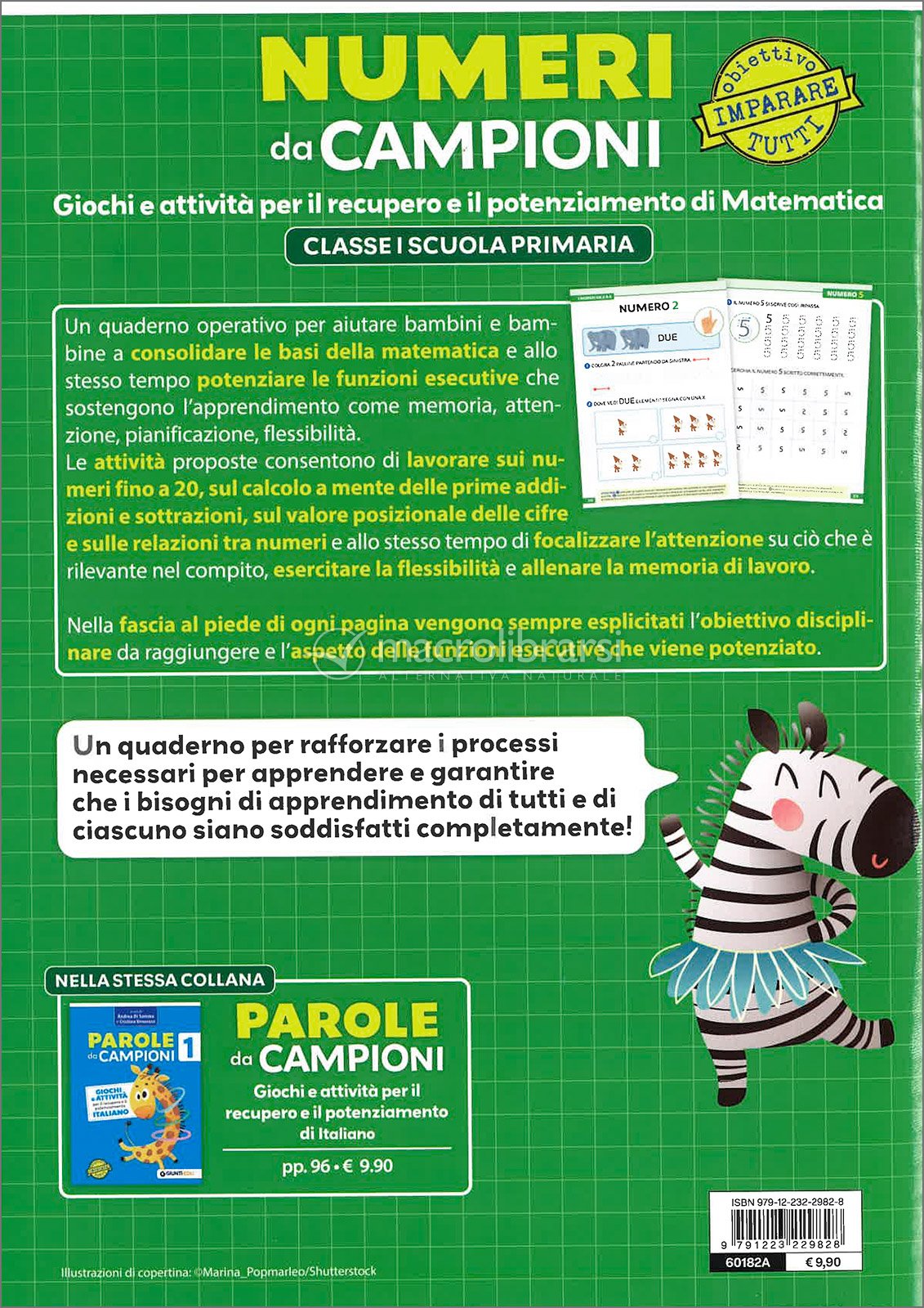 Attraverso giochi ed esercizi mirati, si lavora sui numeri fino a 20, sulle prime addizioni e sottrazioni a mente, sul valore posizionale delle cifre e sulle relazioni tra numeri. Ogni attività aiuta anche a focalizzare ciò che è davvero importante nel compito, potenziando concentrazione e memoria di lavoro.