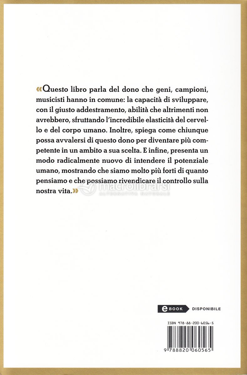 Questo libro parla del dono che geni, campioni, musicisti hanno in comune: la capacità di sviluppare con il giusto addestramento, abilità che altrimenti non avrebbero, sfruttando l'incredibile elasticità del cervello e del corpo umano. Inoltre, spiega come chiunque possa avvalersi di questo dono per diventare più competente in un ambito a sua scelta. E infine, presenta un modo radicalmente nuovo di intendere il potenziale umano, mostrando che siamo molto più forti di quanto pensiamo e che possiamo rivendicare il controllo sulla nostra vita.