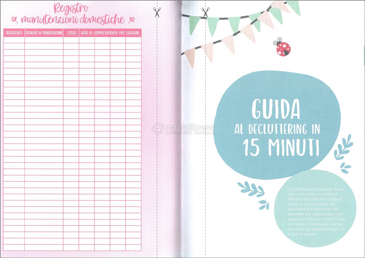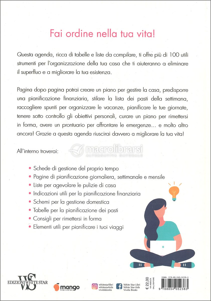 Pagina dopo pagina potrai creare un piano per gestire la casa, predisporre una pianificazione finanziaria, stilare la lista dei pasti della settimana, raccogliere spunti per organizzare le vacanze, pianificare le tue giornate, tenere sotto controllo gli obiettivi personali, curare un piano per rimettersi in forma, avere un prontuario per affrontare le emergenze... e molto altro ancora!
