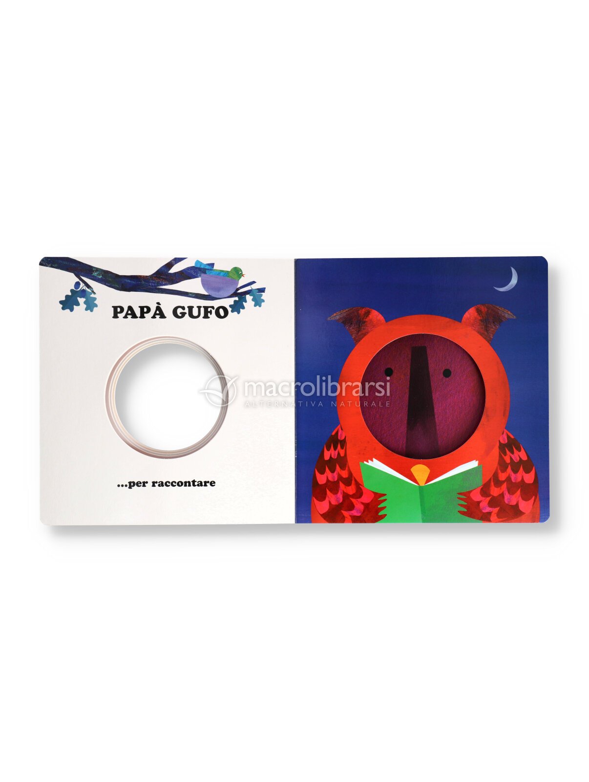 Pagina dopo pagina, il volto del papà appare e scompare attraverso un foro centrale, sorprendendo e divertendo mentre si trasforma in un orso, un polpo, un gorilla, un ghiro, una tigre.