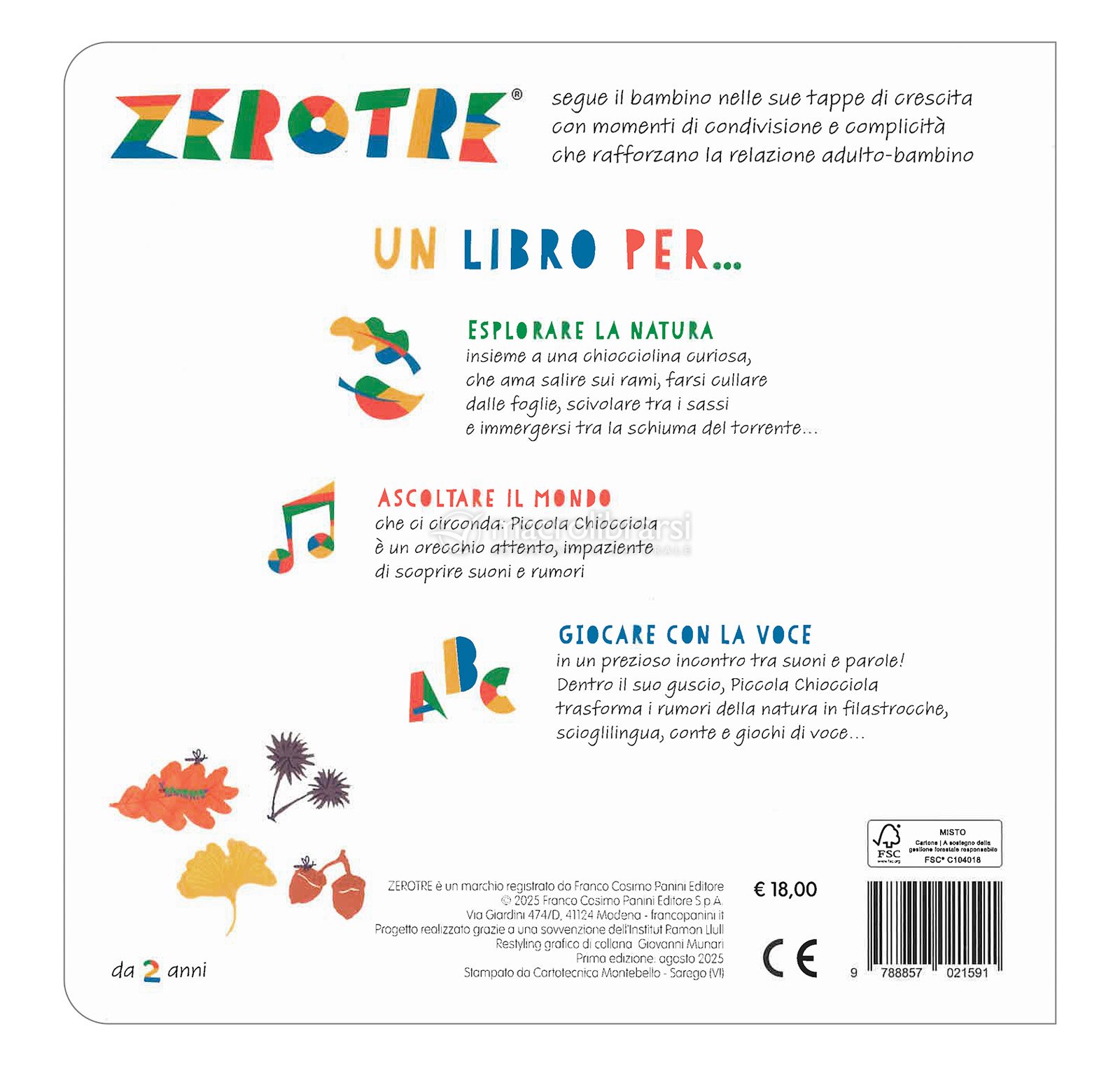 Piccola Chiocciola scopre suoni e rumori della natura, con canzoni, attività e filastrocche, per un incontro di musiche e parole capace di emozionare e divertire.