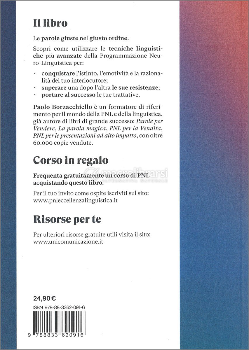 Lo trovi in | Libreria: #Vendita e persuasione #Vendita e persuasione #PNL - Programmazione Neuro Linguistica #Programmazione Neuro Linguistica (PNL) |