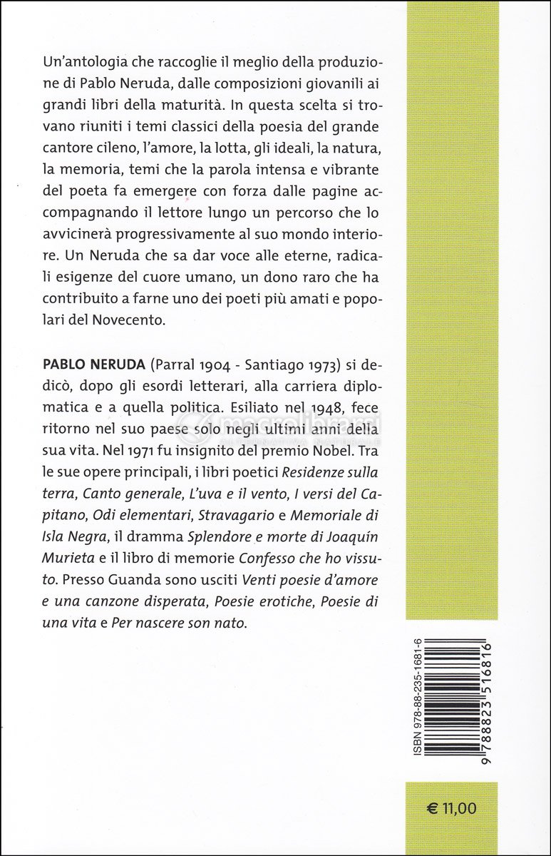 In questa scelta si trovano riuniti i temi classici della poesia del grande cantore cileno, l'amore, la lotta, gli ideali, la natura, la memoria, temi che la parola intensa e vibrante del poeta fa emergere con forza dalle pagine accompagnando il lettore lungo un percorso che lo avvicinerà progressivamente al suo mondo interiore.