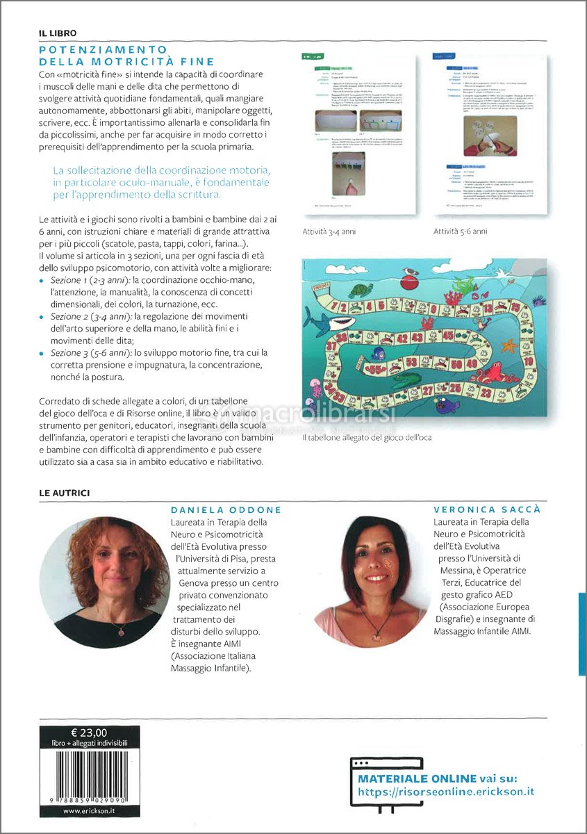 Il volume offre esempi di attività, da realizzare assieme ai bambini e alle bambine dai 2 ai 6 anni, mirate a potenziare le abilità fino-motorie e a favorire lo sviluppo corretto di alcuni dei prerequisiti motori necessari all’apprendimento della scrittura.