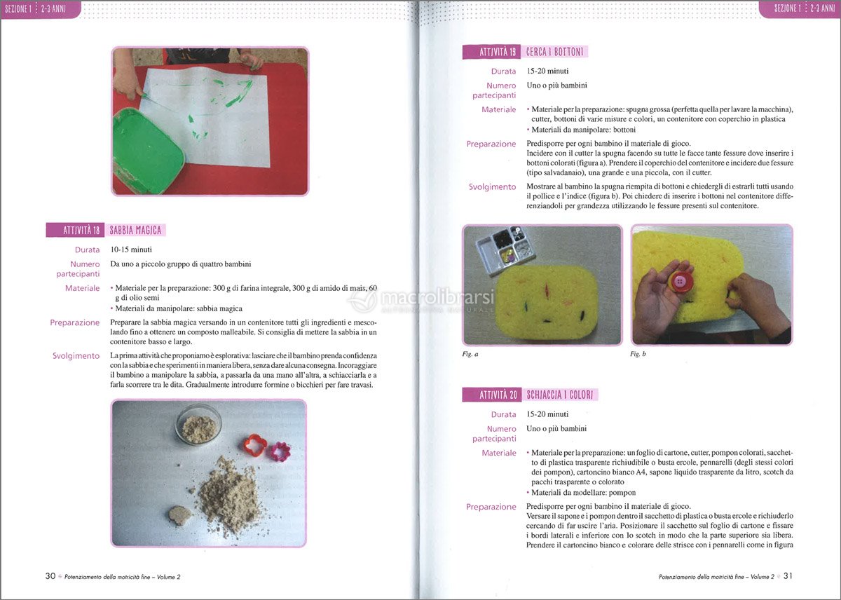 Le attività e i giochi proposti sono rivolti a bambini e bambine dai 2 ai 6 anni, e presentano istruzioni chiare e materiali di grande attrattiva per i più piccoli come scatole, pasta, tappi, colori, farina…