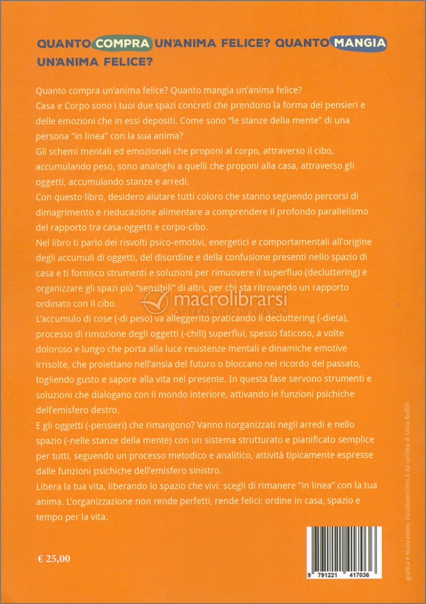 Nel libro ti parlo dei risvolti psico-emotivi, energetici e comportamentali all'origine degli accumuli di oggetti, del disordine e della confusione presenti nello spazio di casa in relazione alle dinamiche del rapporto con il cibo e ti fornisco strumenti e soluzioni per rimuovere il superfluo (decluttering) e organizzare gli spazi più "sensibili" di altri, per chi sta ritrovando un rapporto ordinato con il cibo.