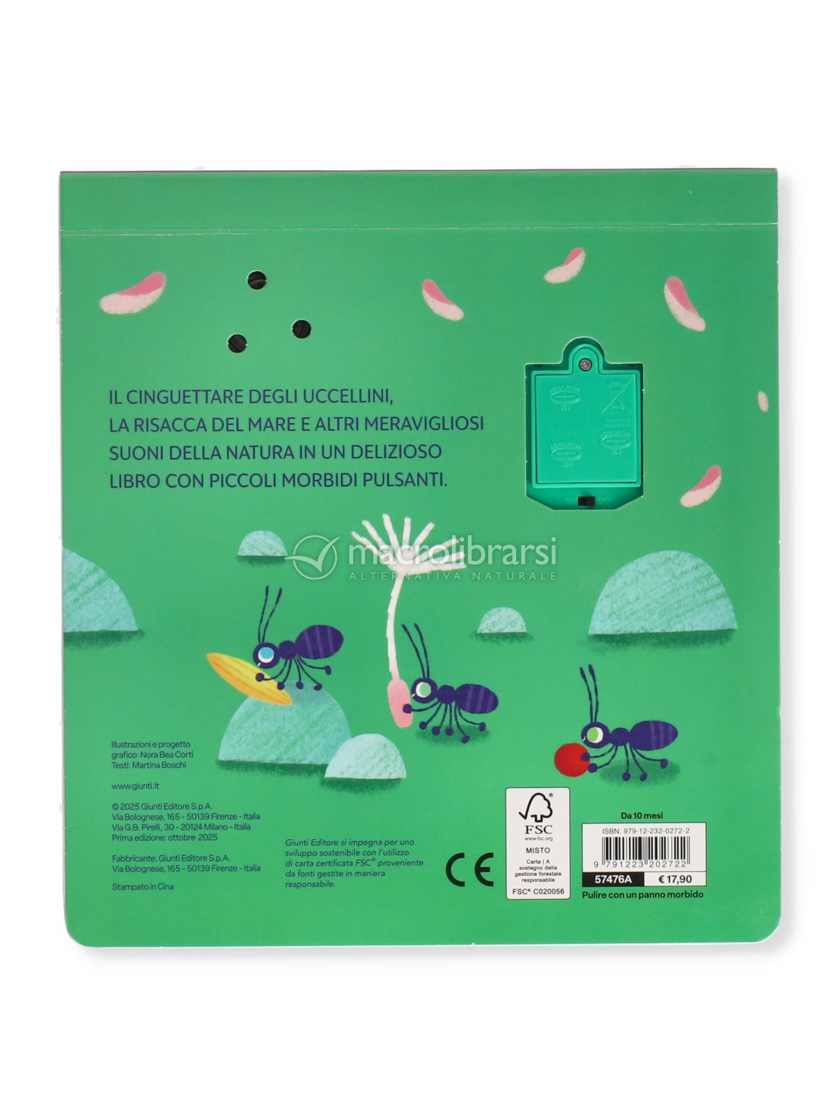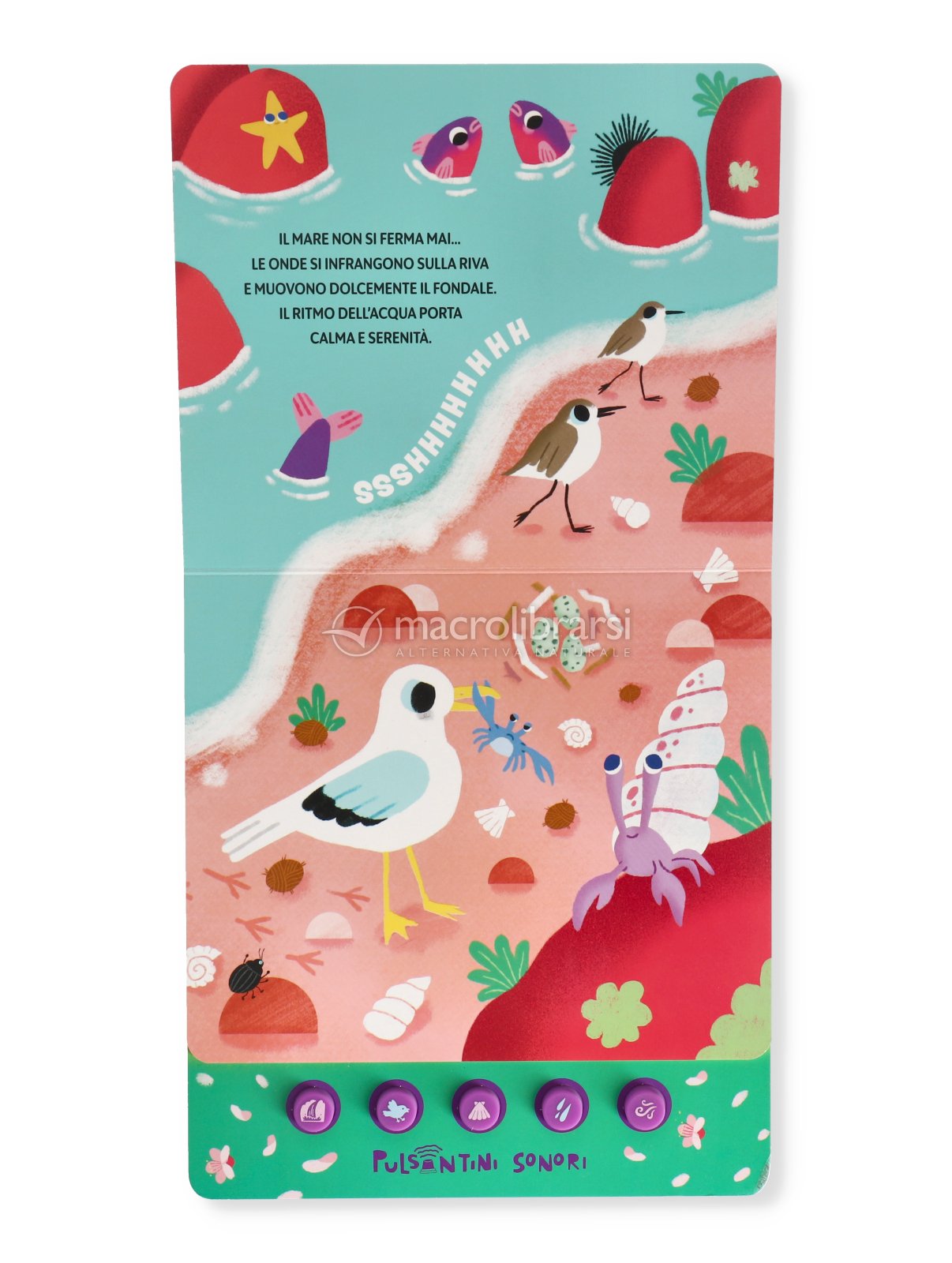 Un libro sonoro per scoprire i suoni della natura: l’acqua del fiume che scorre, gli uccellini che cantano in cielo e le onde che portano calma e serenità.