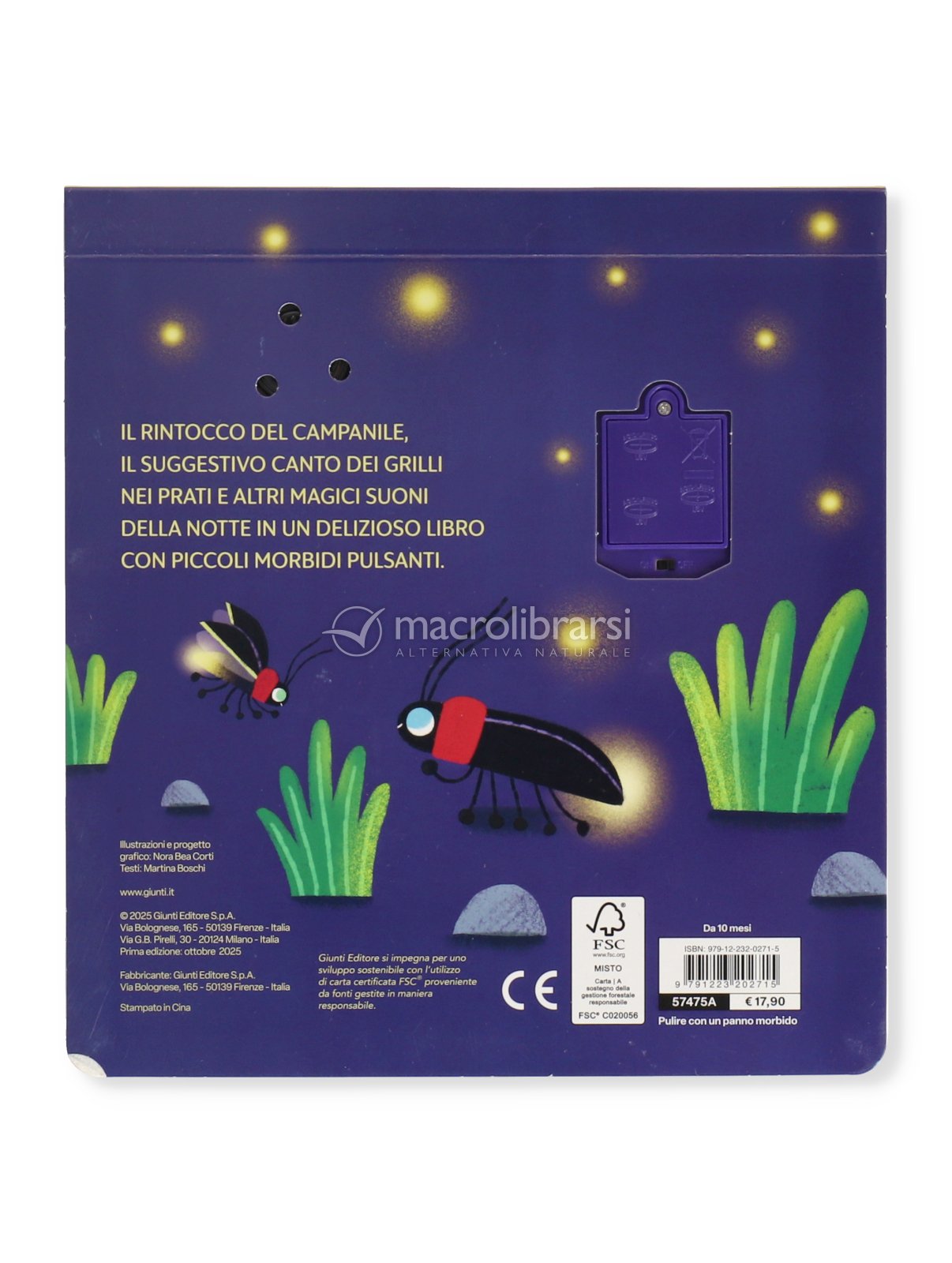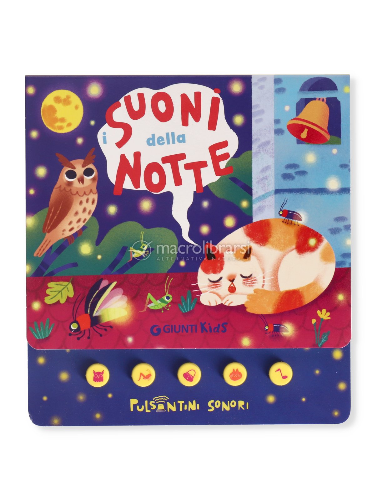 Un piccolo libro sonoro per scoprire i suoni della notte: il gufo che bubola, i grilli che cantano, il gattino che fa le fusa e il campanile che rintocca nel silenzio.