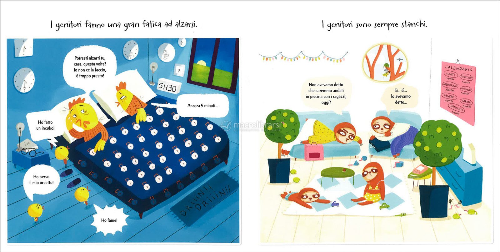 Attraverso un gioco di associazioni tra genitori e animali, il libro racconta situazioni quotidiane in chiave esilarante, tra bradipi distratti, pappagalli chiacchieroni e pesci smemorati.