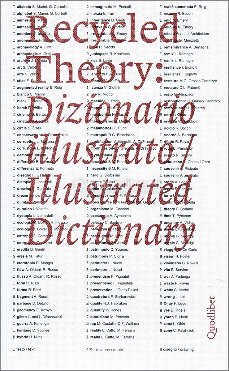 EN. Recycled Theory is a multidisciplinary dictionary made of entries in form of texts, drawings and quotes, which explore the concept of "recycling" in design cultures and in the theories that nurture them. Usually we recycle things, objects, spaces but more often we return on principles and approaches to rearrange them, put them back into circulation, and override them. The practice of recycling is therefore placed in an area of negotiation between memory and amnesia, it brings out the unexpected self-regeneration potential of what exists, our ability to preserve and reinvent it, even through its partial breakdown.