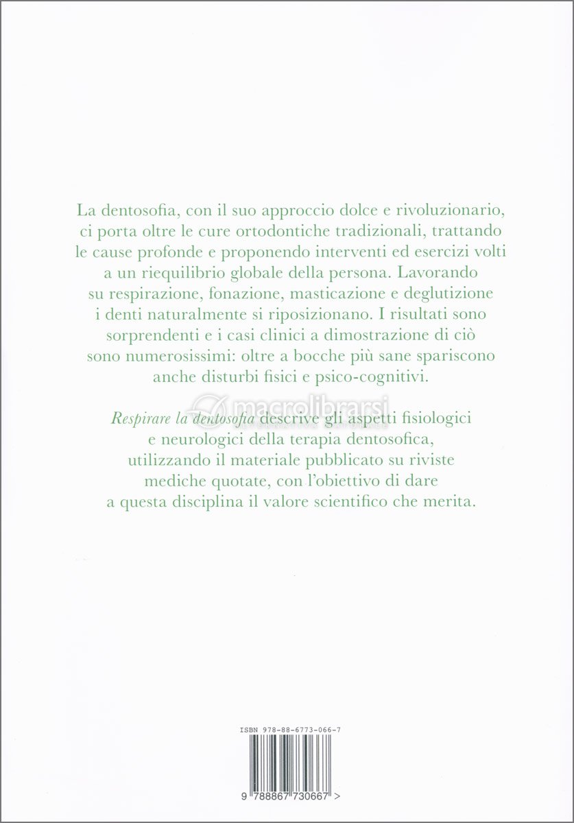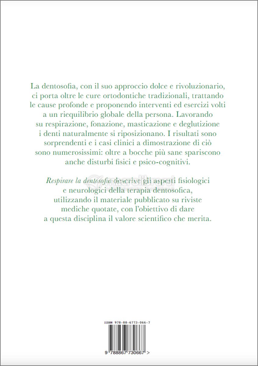 Respirare la dentosofia descrive gli aspetti fisiologici e neurologici della terapia dentosofica, utilizzando il materiale pubblicato su riviste mediche quotate, con l’obiettivo di dare a questa disciplina il valore scientifico che merita.