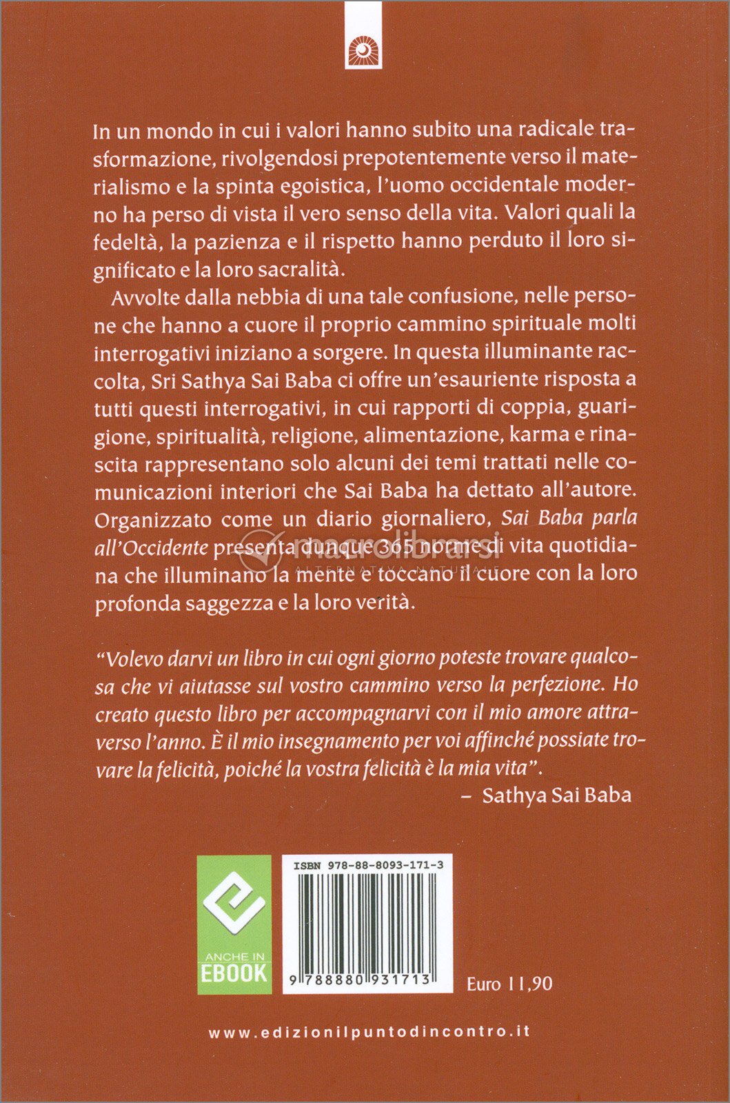 Ho ricevuto questo libro per la prima volta da una persona cara ,per aiutarmi in un momento complicato della mia vita. E ricevere questo dono ti cambia la vita...sono 365 giorni dell'anno, una per giorno, in cui il Maestro Satya Sai Baba trasmette riflessioni potenti profonde...che scavano in noi e arrivano alla nostra essenza...è una lettura quotidiana, lo rileggo da quasi dieci anni, e ogni giorno colgo una sfumatura sempre diversa e più profonda al messaggio che mi giunge...cambia la visione della vita e delle cose...e cosi cambia con te anche la tua vita. INCREDIBILE!!!