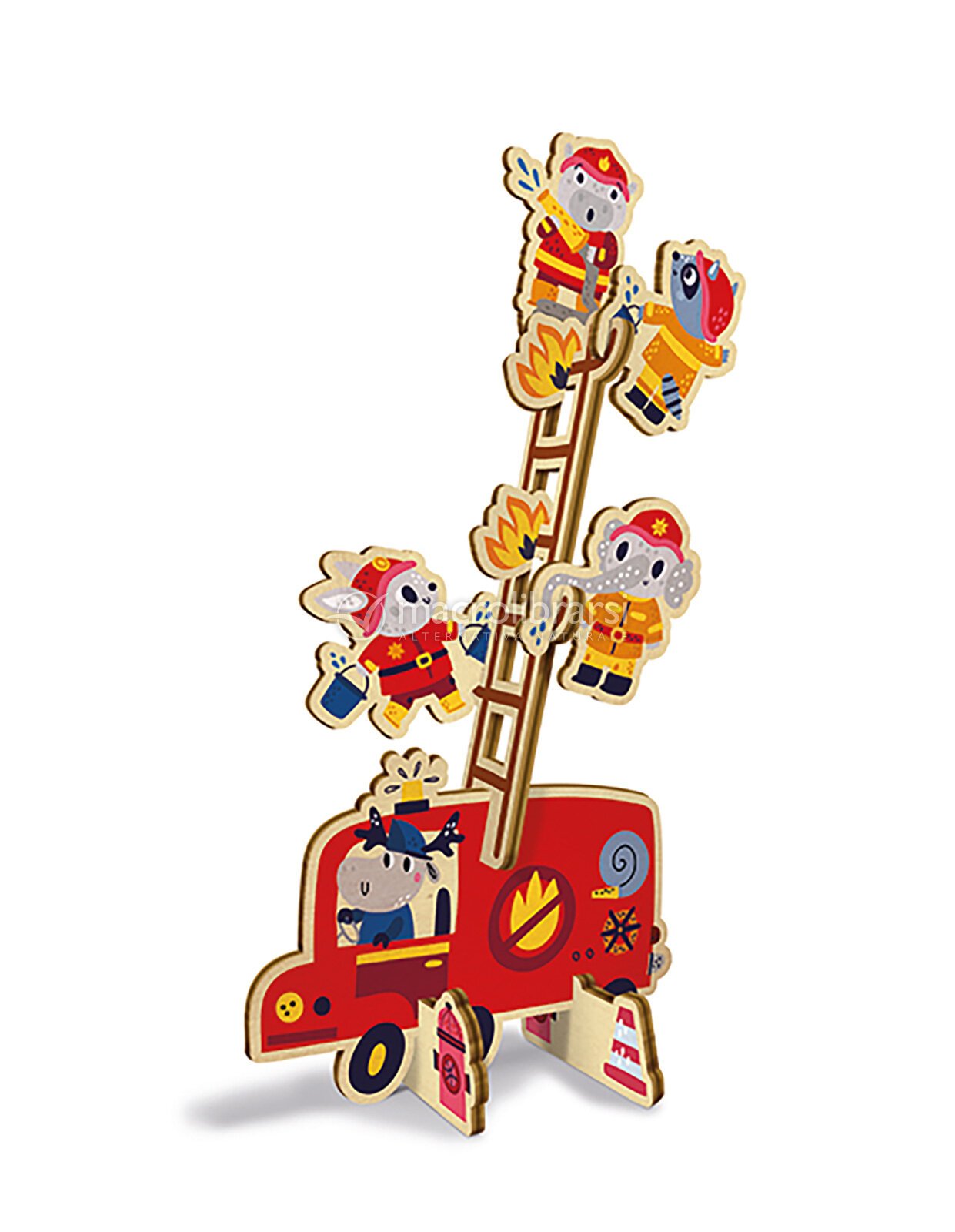 La confezione contiene anche un puzzle tridimensionale in legno per mettere in scena tante storie inventate con i pompieri pasticcioni.