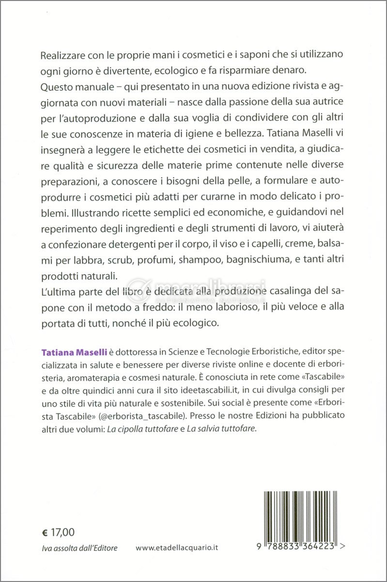 Tatiana Maselli vi insegnerà a leggere le etichette dei cosmetici in vendita, a giudicare qualità e sicurezza delle materie prime contenute nelle diverse preparazioni, a conoscere i bisogni della pelle, a formulare e autoprodurre i cosmetici più adatti per curarne in modo delicato i problemi.