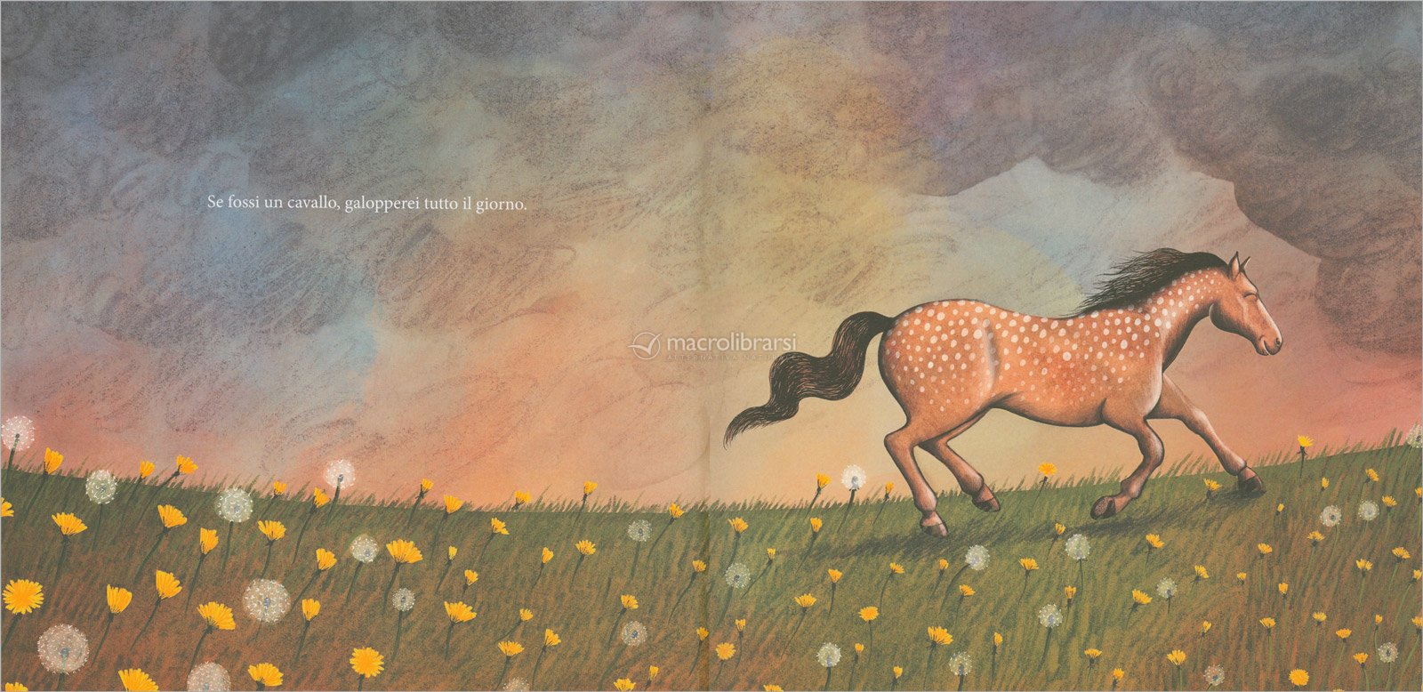 Con il ritmo lieve di un sogno, questo albo accompagna i bambini in un viaggio nell’immaginazione, dove ogni cosa diventa possibile: correre tra i prati, sentire il vento sul muso, vivere liberi e felici, senza regole né confini.