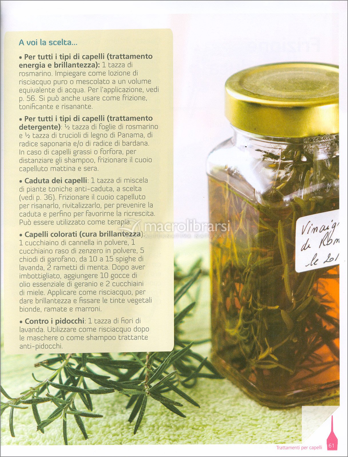Pagina dopo pagina scoprirete 80 ricette 100% naturali, che vi accompagneranno dal lavaggio ai diversi trattamenti per la salute e la bellezza (lozioni, frizioni, maschere), fino alle tinture. Gli ingredienti sono per la gran parte di uso comune, come aceto, yogurt, miele, uovo, tutti dalle sorprendenti qualità per la cura della capigliatura. Presenti anche numerose piante dalle proprietà detergenti (edera, saponaria ecc.), curative (salvia, rosmarino, zenzero) e abbellenti (aloe, avocado ecc.).