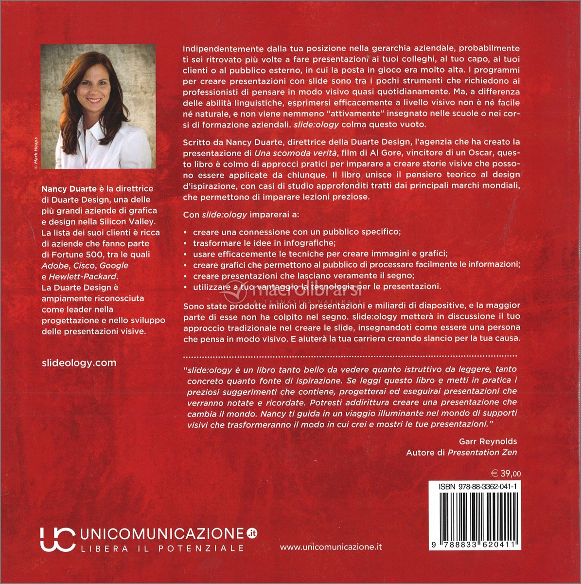 "Slide.ology è un libro tanto bello da vedere quanto istruttivo da leggere, tanto concreto quanto fonte di ispirazione. Se leggi questo libro e metti in pratica i preziosi suggerimenti che contiene, progetterai ed eseguirai presentazioni che verranno notate e ricordate. Potresti addirittura creare una presentazione che cambia il mondo. Nancy ti guida in un viaggio illuminante nel mondo di supporti visivi che trasformeranno il modo in cui crei e mostri le tue presentazioni."