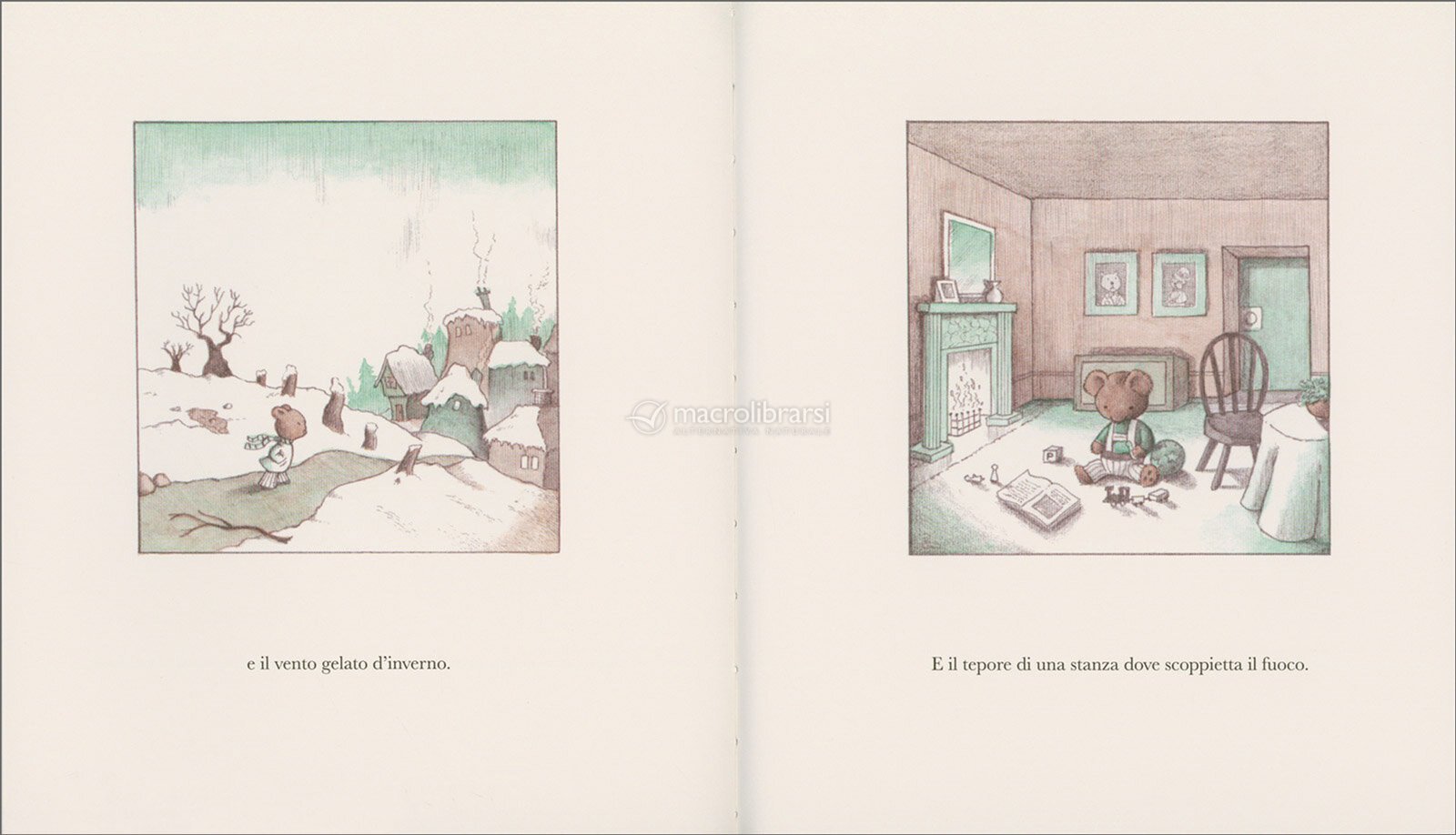 Con il suo maglione verde a collo alto e la sua salopette a righe, l’orsetto esce di casa e, tutto solo, prende il viottolo segreto e passeggia tra gli alberi, canticchia e si guarda intorno.