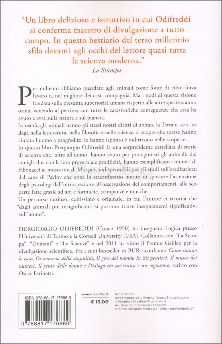 In questo libro Piergiorgio Odifreddi fa una sorprendente carrellata di storie di scienza che, oltre all'uomo, hanno avuto per protagonisti gli animali: dai conigli che, con la loro proverbiale prolificità, hanno esemplificato i numeri di Fibonacci ai moscerini di Morgan, indispensabili per gli studi sull'ereditarietà; dal cane di Pavlov che ebbe lo straordinario merito di spostare l'attenzione degli psicologi dall'introspezione all'osservazione dei comportamenti, alle scoperte fatte grazie ad api e formiche, scimpanzé e mucche.