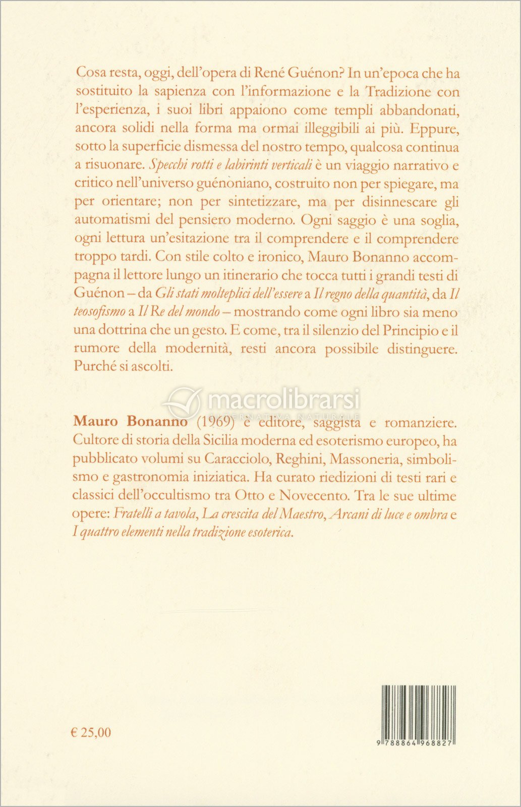 "Specchi rotti e labirinti verticali" è un viaggio narrativo e critico nell’universo guénoniano, costruito non per spiegare, ma per orientare; non per sintetizzare, ma per disinnescare gli automatismi del pensiero moderno.
