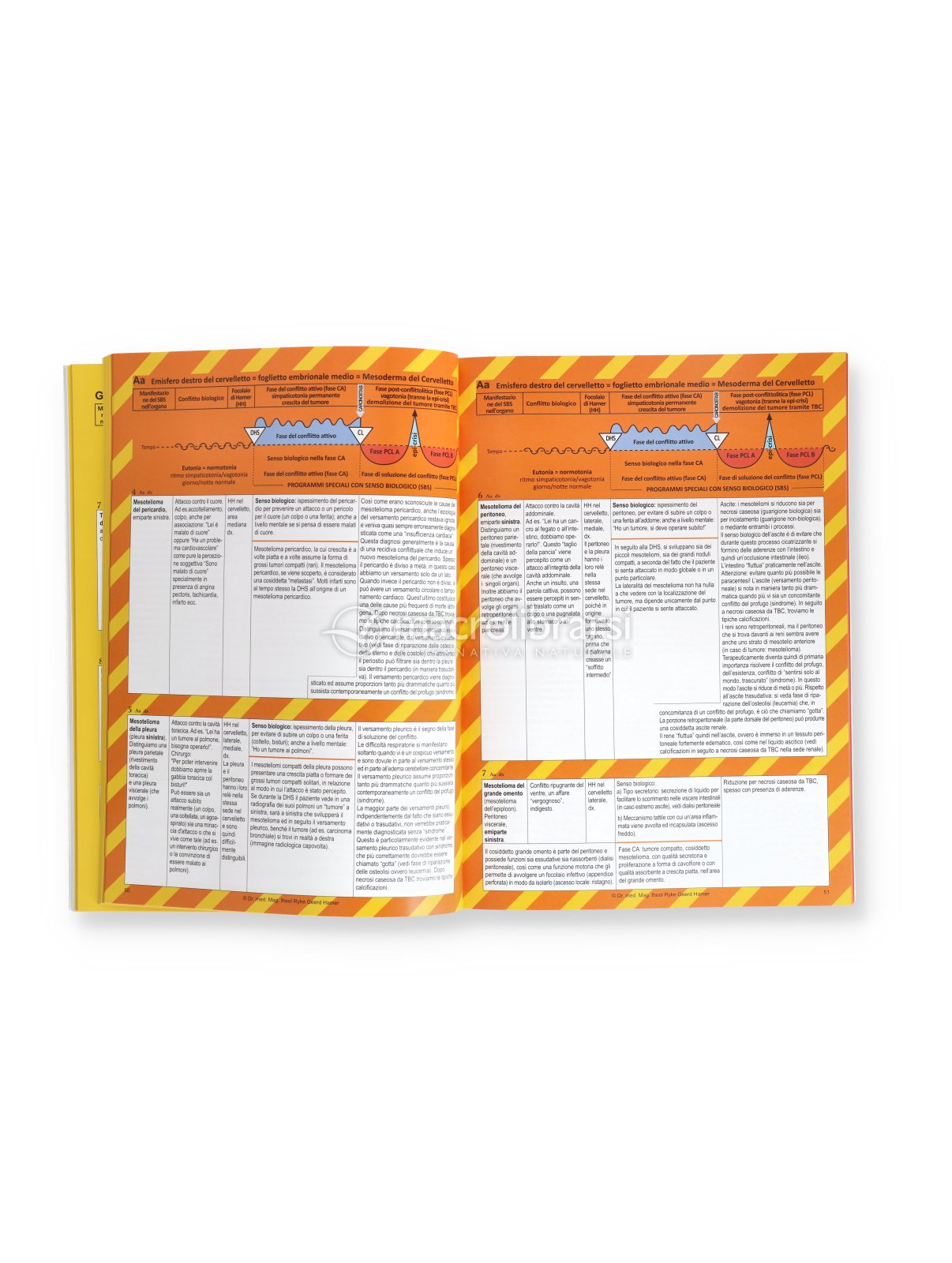 Biologico, distinguendo tra fase di conflitto attivo e fase di riparazione, e osservando come i diversi tessuti reagiscano in modo specifico. Le tabelle costituiscono il cuore dell’opera: ogni pagina analizza singoli organi o parti del corpo, descrivendo il conflitto scatenante, le modificazioni biologiche nelle diverse fasi e il cosiddetto “senso biologico”.