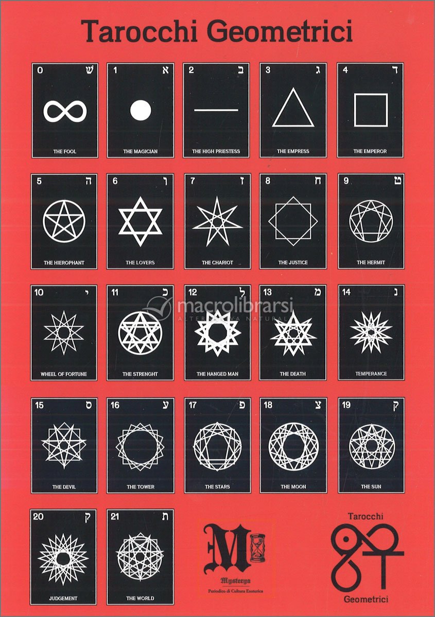 Per rimandare all'iconografia dei Tarocchi si ò lasciato il nome (in inglese) e alla lettera ebraica corrispondente, poiché anch'essa, secondo le regole della ghematria ebraica conduce ad un numero e quindi alla geometria.