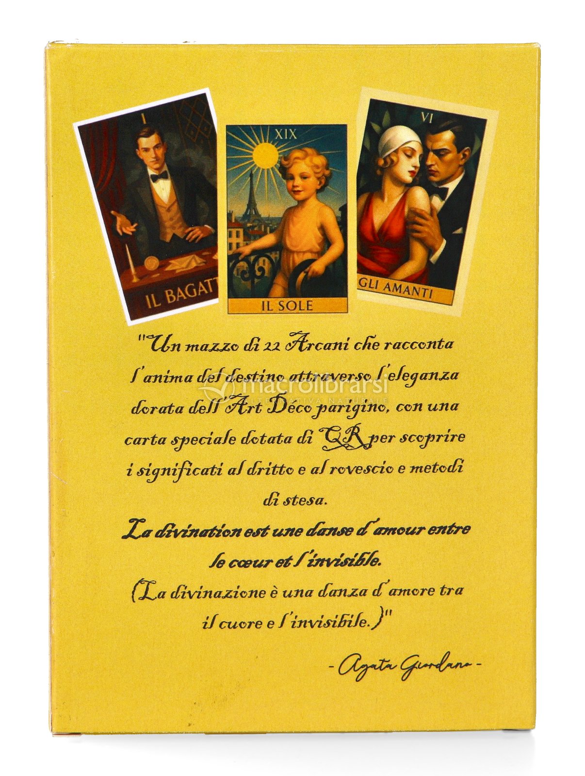 Il Tarot Decò è un raffinato mazzo di 22 Arcani Maggiori che racconta l’anima del destino attraverso l’eleganza dorata dell’Art Déco parigino. Linee geometriche, atmosfere d’epoca e dettagli preziosi rendono ogni carta un piccolo quadro da contemplare, oltre che uno strumento divinatorio.
