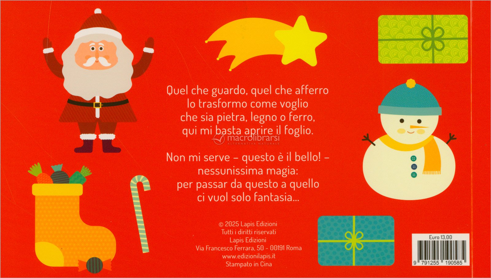 A ogni pagina, sollevando un’aletta, gli oggetti del Natale cambiano forma: le palline diventano un pupazzo di neve, la stella cometa si trasforma in un aiutante di Babbo Natale e nuovi personaggi appaiono fino ad arrivare alla Befana.