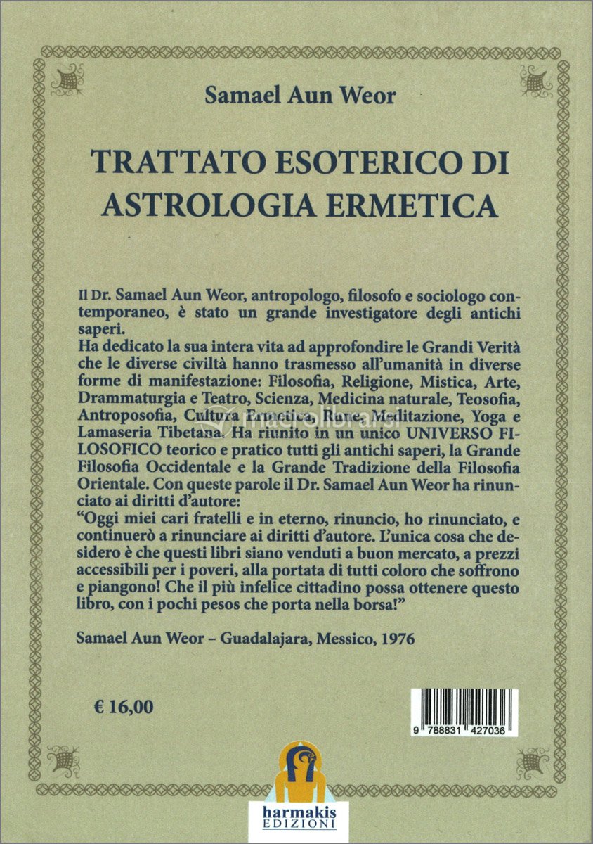 “Oggi miei cari fratelli e in eterno, rinuncio, ho rinunciato, e continuerò a rinunciare ai diritti d’autore. L’unica cosa che desidero è che questi libri siano venduti a buon mercato, a prezzi accessibili per i poveri, alla portata di tutti coloro che soffrono e piangono! Che il più infelice cittadino possa ottenere questo libro, con i pochi pesos che porta nella borsa!” Samael Aun Weor – Guadalajara, Messico, 1976