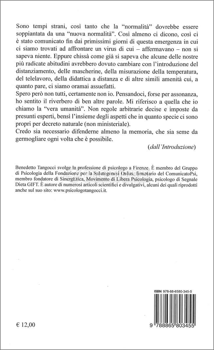 L’autore, Benedetto Tangocci, nel libro Umanità sotto scacco, riflette su ben altre parole, quelle che lui chiama la “vera umanità”: non regole arbitrarie decise e imposte da presunti esperti, bensì l’insieme degli aspetti che in quanto specie ci sono propri per decreto naturale (non ministeriale), affinché sia possibile difenderne almeno la memoria, che sia seme da germogliare ogni volta che è possibile.