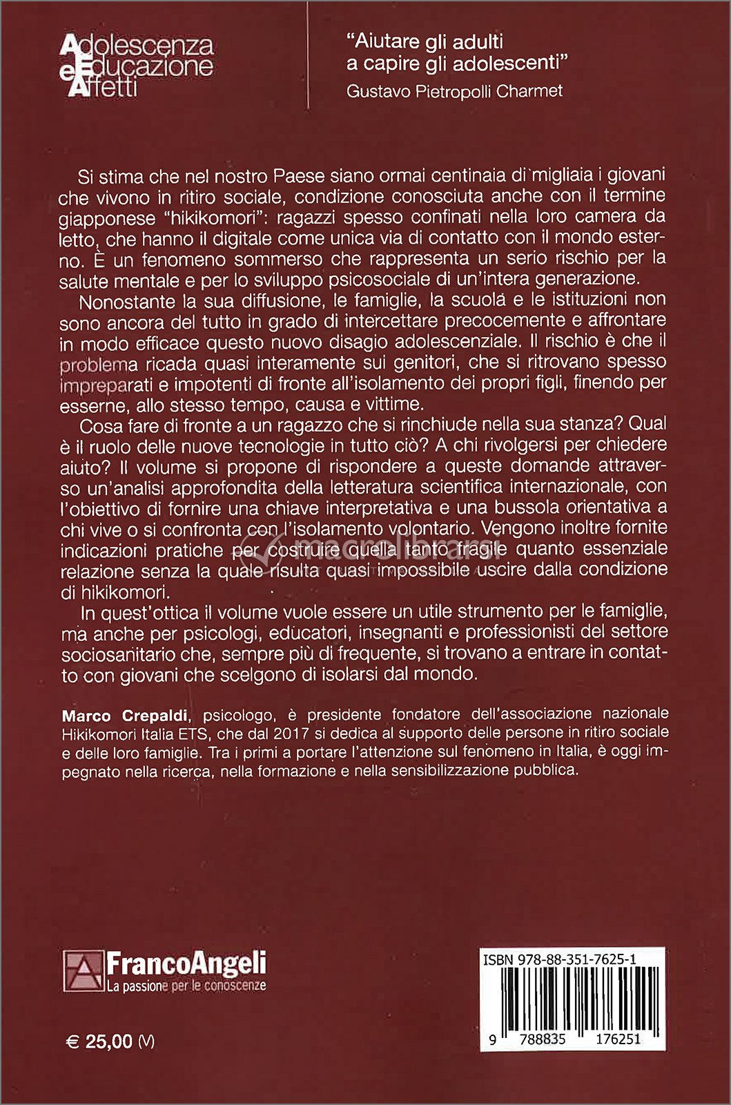 In quest'ottica il volume vuole essere un utile strumento per le famiglie, ma anche per psicologi, educatori, insegnanti e professionisti del settore sociosanitario che, sempre più di frequente, si trovano a entrare in contatto con giovani che scelgono di isolarsi dal mondo.