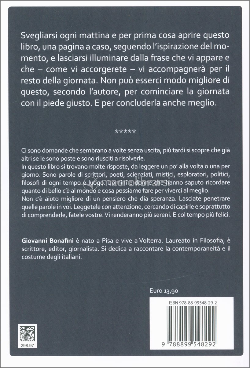 Svegliarsi ogni mattina e per prima cosa aprire questo libro, una pagina a caso, seguendo l'ispirazione del momento, e lasciarsi illuminare dalla frase che vi appare e che — come vi accorgerete — ví accompagnerà per il resto della giornata.