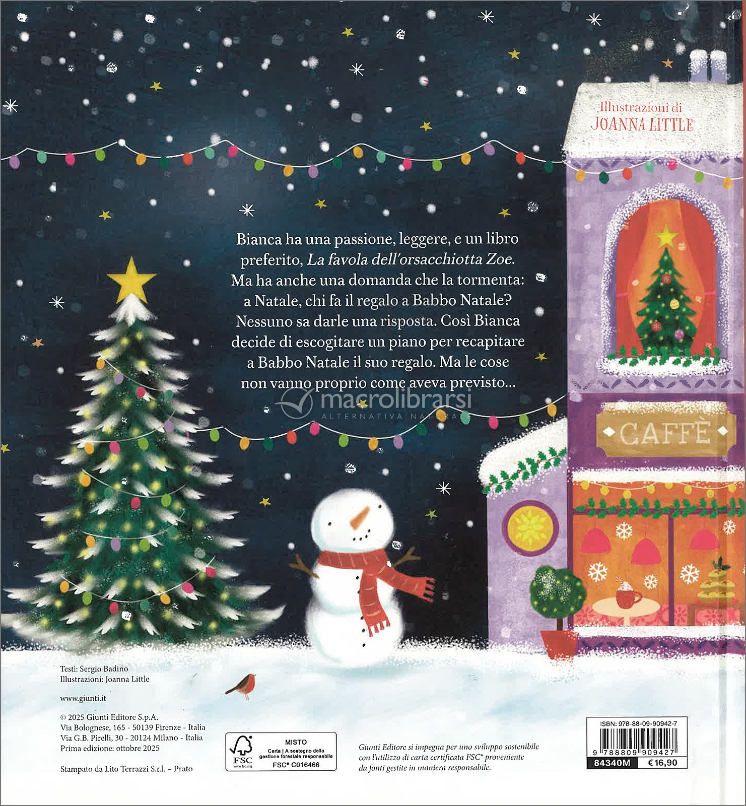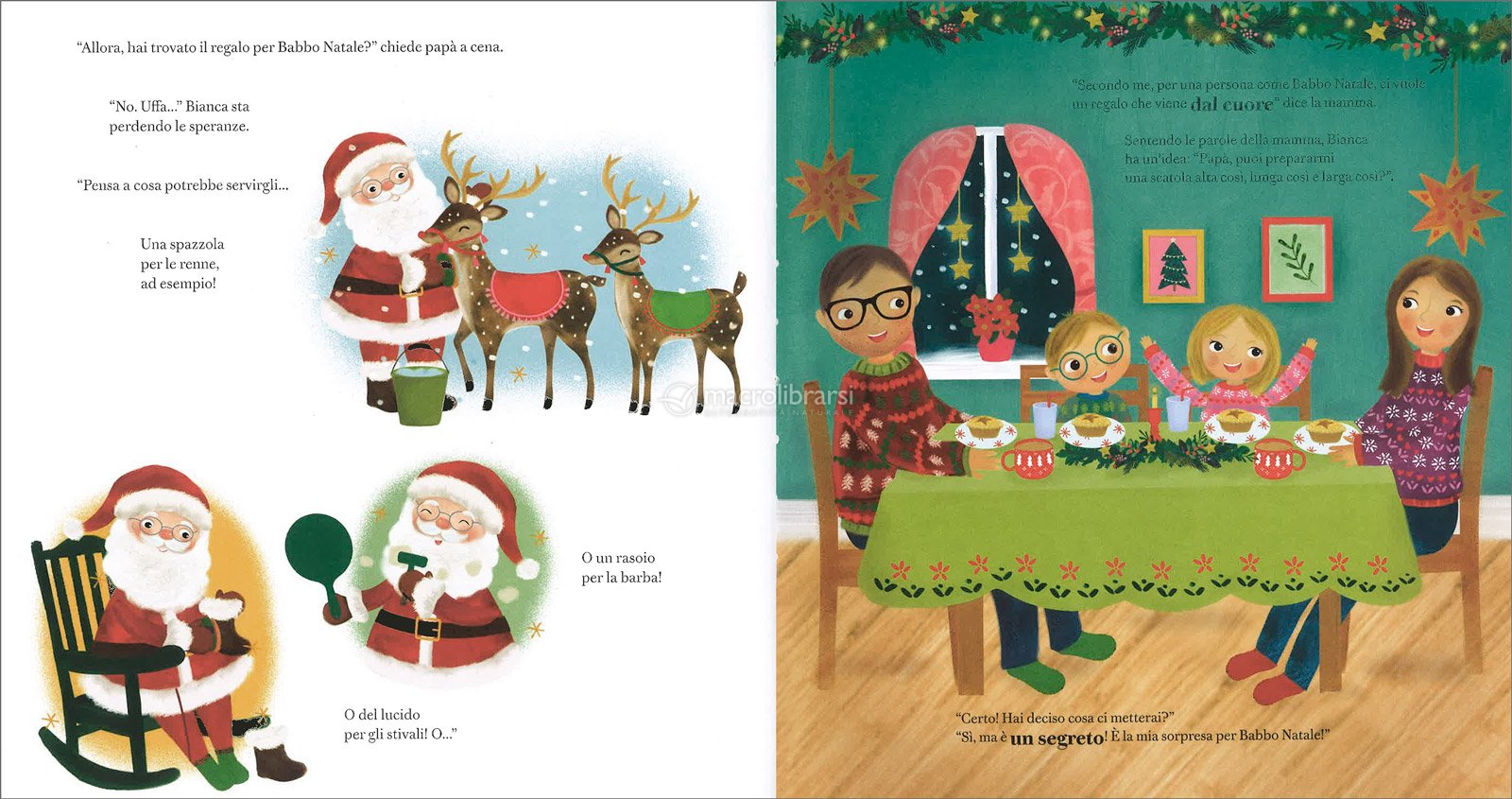 Bianca ama i libri più di ogni altra cosa. Una sera, mentre il papà legge la sua storia preferita a lei e al fratellino Marco, una domanda le sorge spontanea: «Ma a Natale, chi fa il regalo a Babbo Natale?» Nessuno lo sa, ma Bianca decide di scoprirlo... e di preparare un dono tutto per lui! Tra slitte, renne e una corsa verso il Polo Nord, la sua idea si trasforma in un’avventura tenera e piena di magia.