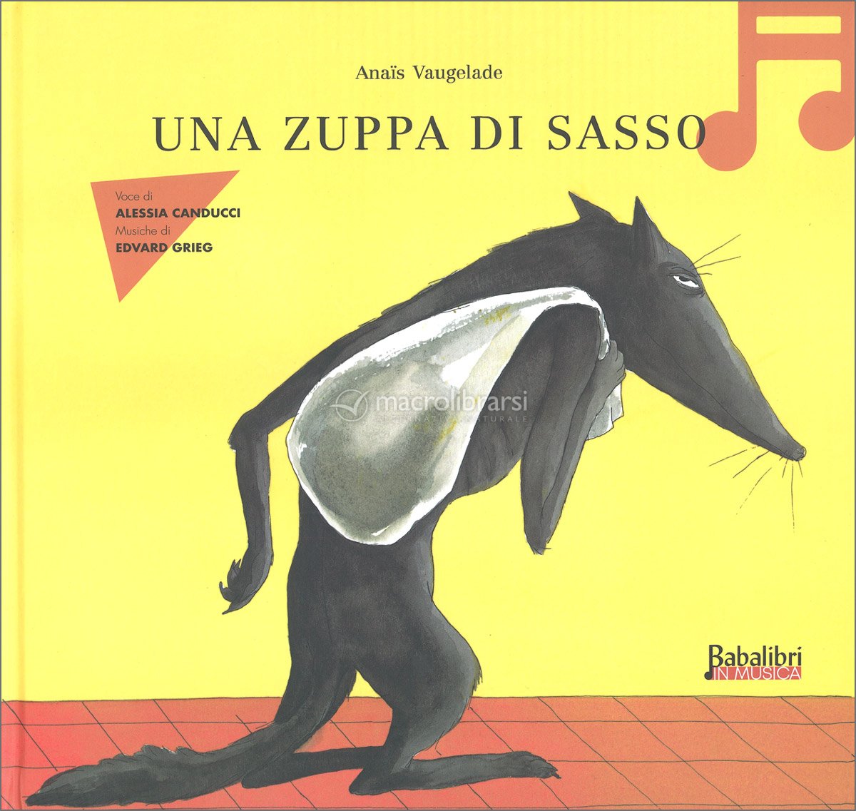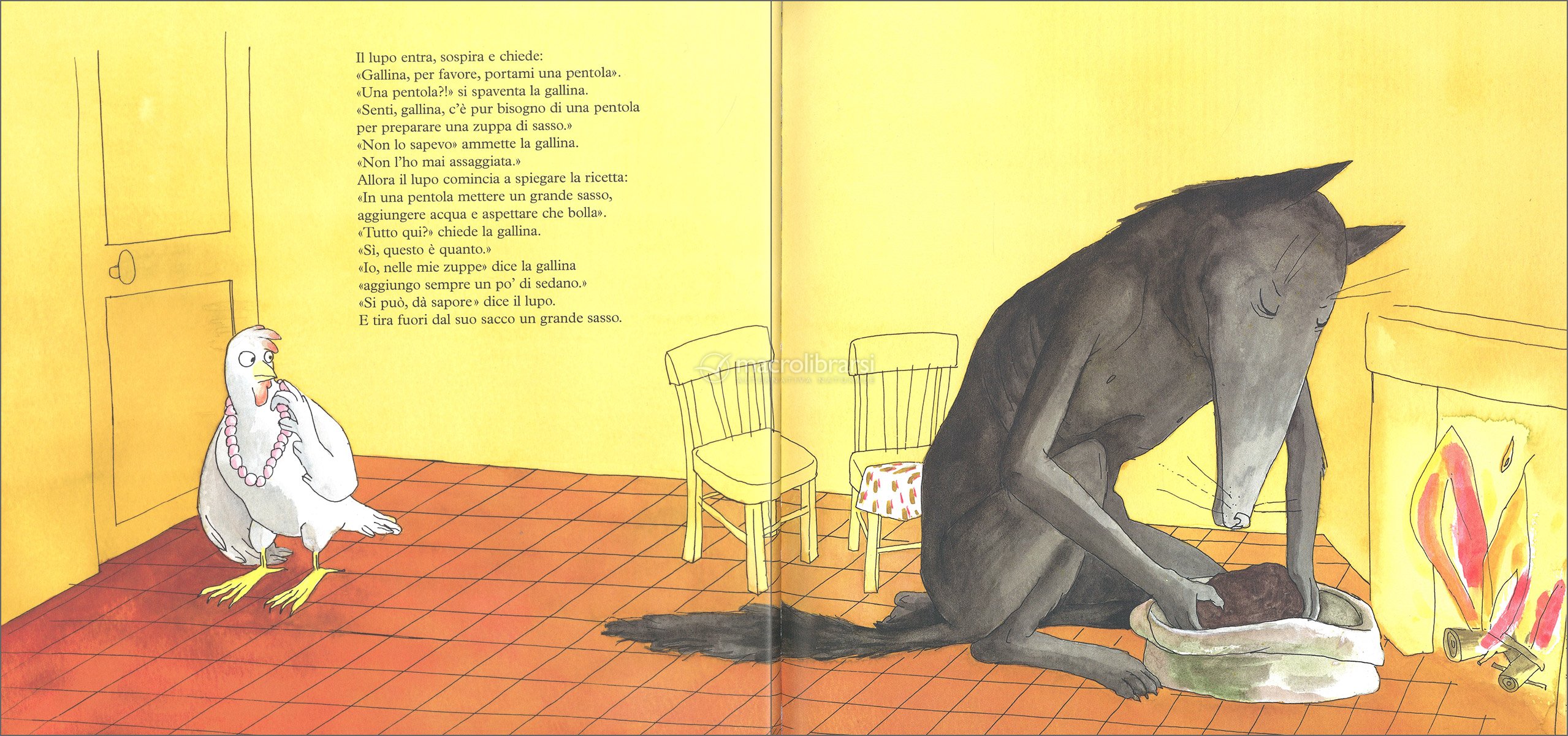È notte. È inverno. Un vecchio lupo cerca ospitalità nel villaggio degli animali per cucinare una zuppa di sasso. Finirà con una grande cena con tutti gli animali, curiosi di conoscere un lupo dal vero.