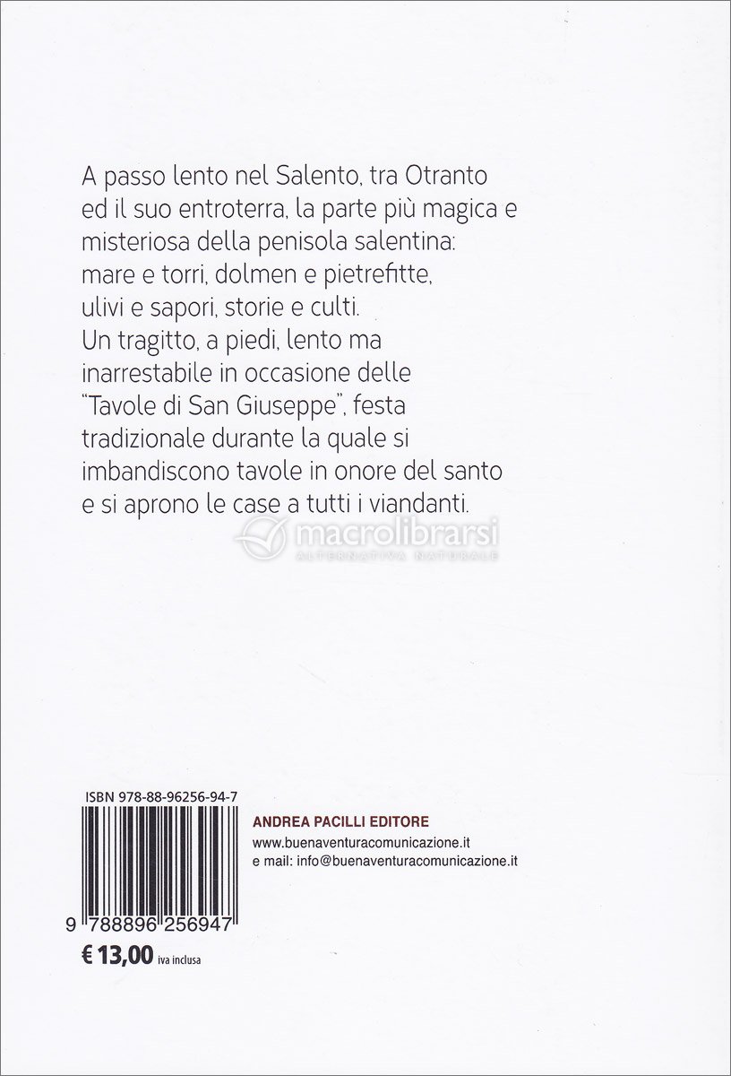 A passo lento nel Salento tra Otranto ed il suo entroterra, la parte più magica e misteriosa della penisola salentina: mare e torri, dolmen e pietrefitte, ulivi e sapori, storie e culti. Un tragitto, a piedi, lento ma inarrestabile in occasione delle "Tavole di San Giuseppe", festa tradizionale durante la quale si imbandiscono tavole in onore del santo e si aprono le case a tutti i viandanti.