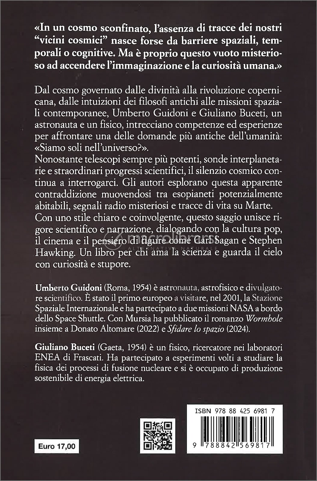 Dal cosmo governato dalle divinità alla rivoluzione copernicana, dalle intuizioni dei filosofi antichi alle missioni spaziali contemporanee, Umberto Guidoni e Giuliano Buceti, un astronauta e un fisico, intrecciano competenze ed esperienze per affrontare una delle domande più antiche dell’umanità: «Siamo soli nell’universo?».