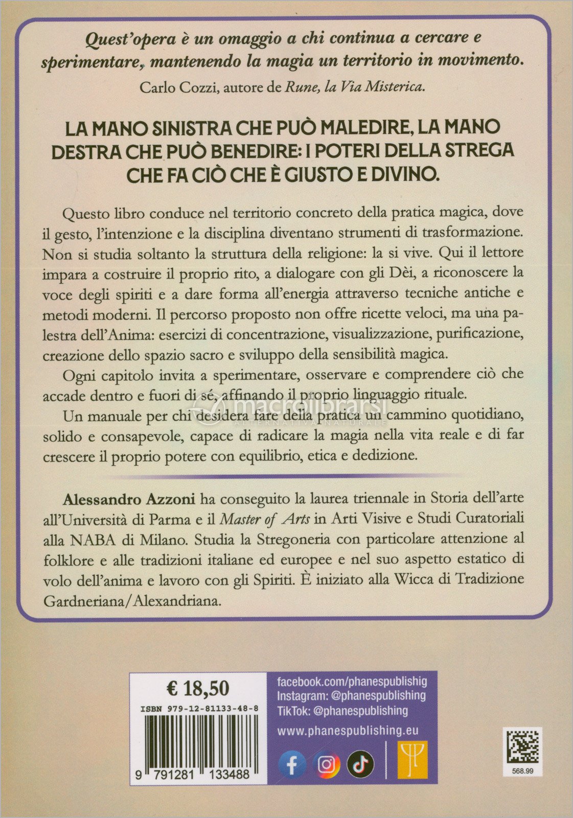 In questo libro Alessandro Azzoni approfondisce ritualità, simbologia e lavoro energetico, offrendo strumenti teorici e riflessioni utili a chi desidera integrare la Wicca nella propria esperienza personale in modo equilibrato e responsabile.