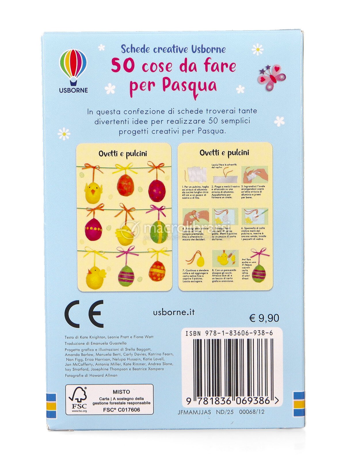 Non si tratta di un vero e proprio libro, ma di Schede Creative pubblicate da Usborne e tradotte da Emanuela Guastella, propone una raccolta di idee creative pensate per coinvolgere i bambini nella realizzazione di decorazioni e lavoretti a tema pasquale.