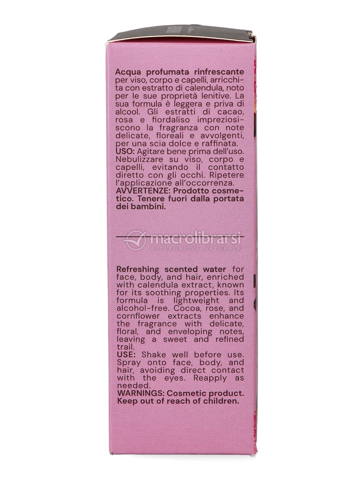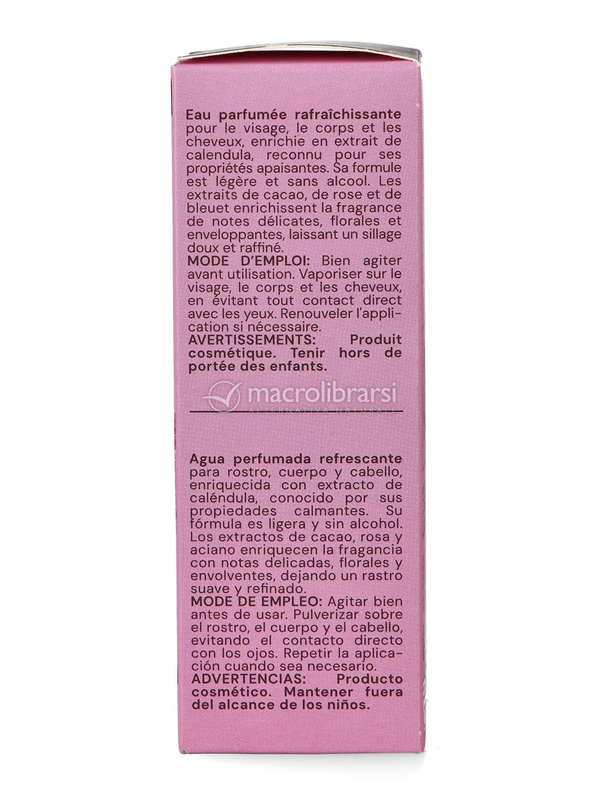 Acqua profumata rinfrescante per viso, corpo e capelli al profumo dolce e floreale di rosa e fiordaliso.