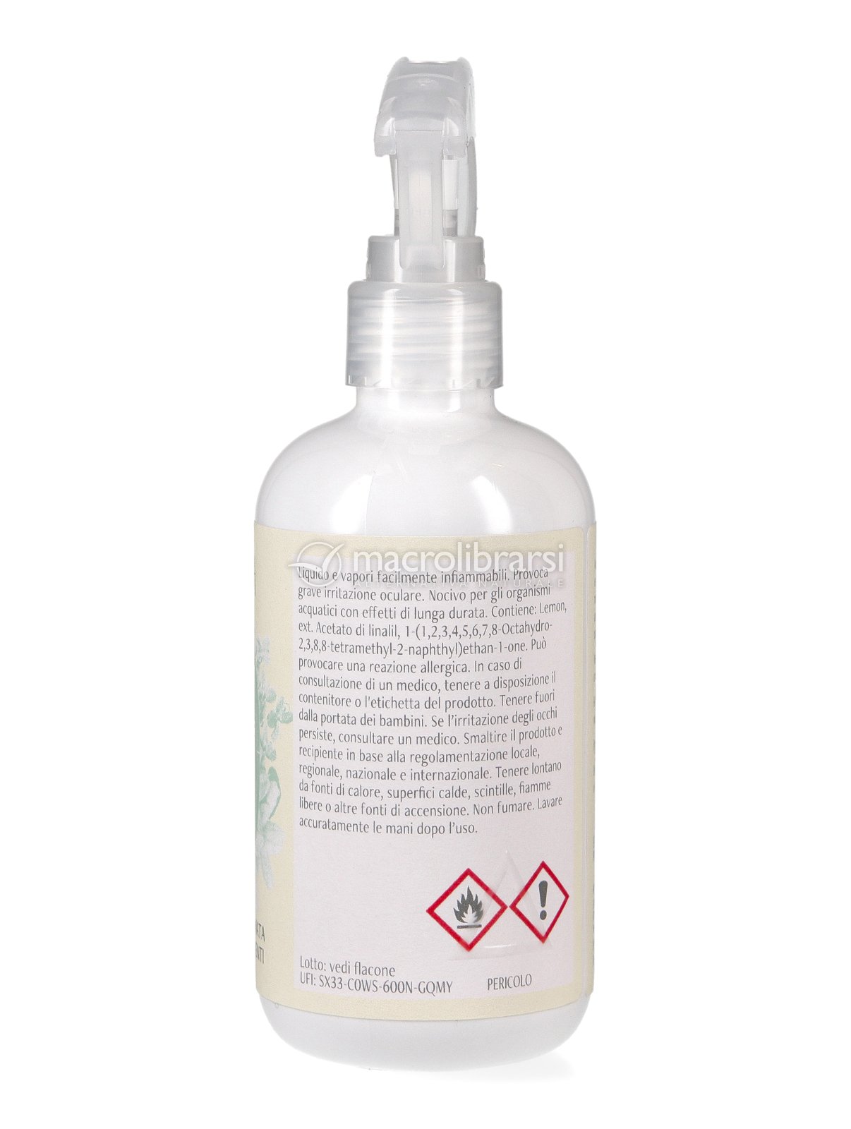 | Avvertenze | Liquido e vapori facilmente infiammabili. Provoca grave irritazione oculare. Nocivo per gli organismi acquatici con effetti di lunga durata. Contiene: Lemon, ext. Acetato di linalil, 1-(1,2,3,4,5,6,7,8-Octahydro-2,3,8,8-tetramethyl-2-naphthyl)ethan-1-one. Può provocare una reazione allergica. In caso di consultazione di un medico, tenere a disposizione il contenitore o l'etichetta del prodotto. Tenere fuori dalla portata dei bambini. Se l'irritazione degli occhi persiste, consultare un medico. Smaltire il prodotto e recipiente in base alla regolamentazione locale, regionale, nazionale e internazionale. Tenere lontano da fonti di calore, superfici calde, scintille, fiamme libere o altre fonti di accensione. Non fumare. Lavare accuratamente le mani dopo l'uso. |
