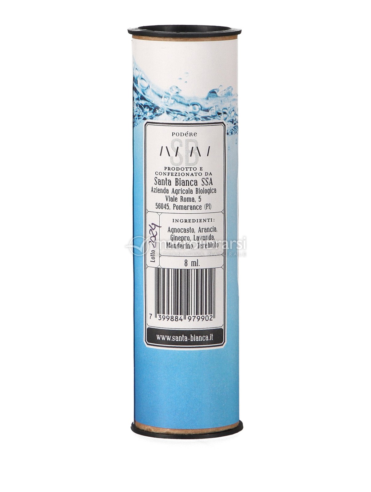 La miscela rinfrescante Acqua di Santa Bianca contiene un mix di oli essenziali capaci di purificare l'aria e aiutare nella concentrazione.