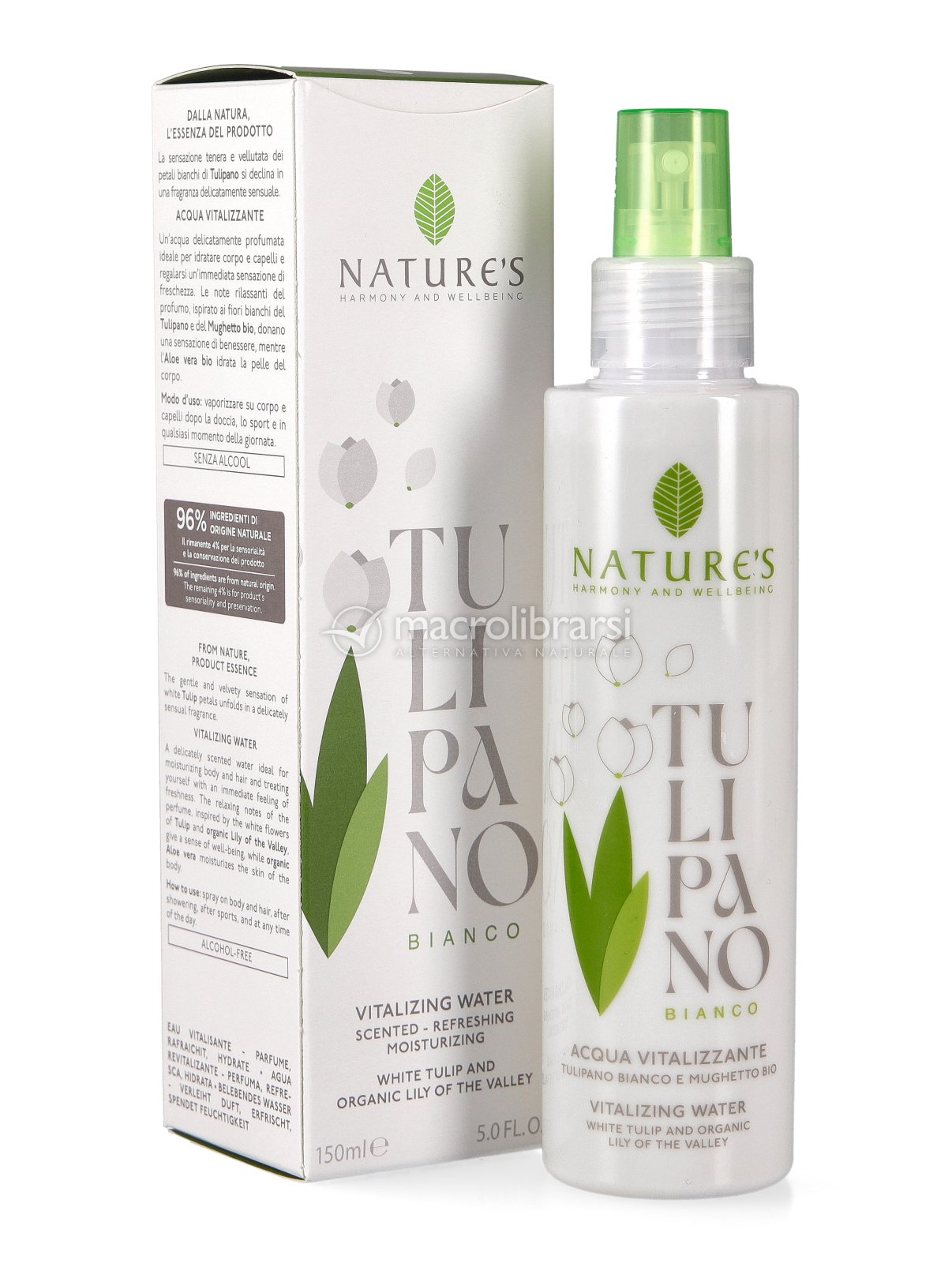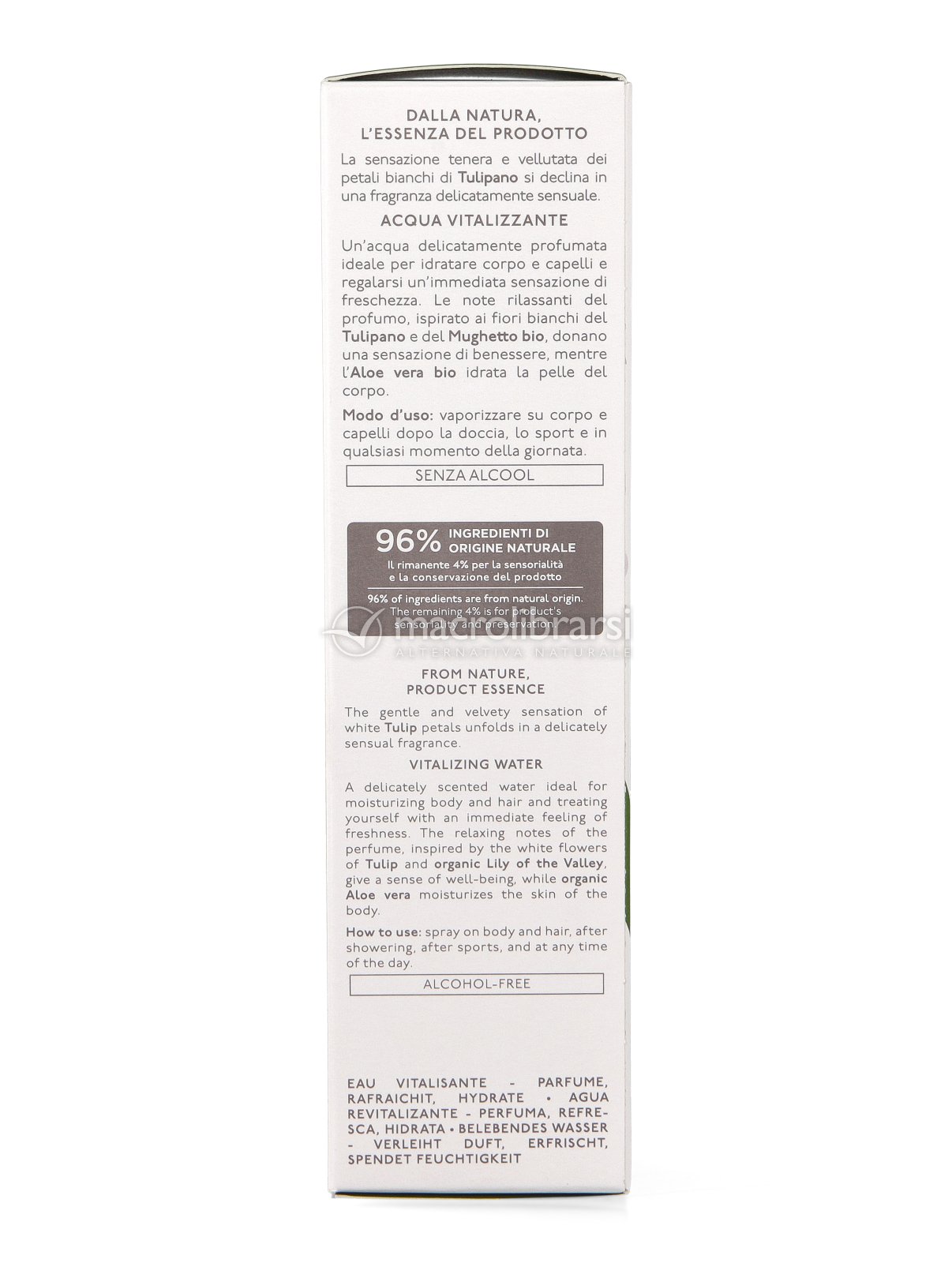 L’Acqua Vitalizzante Tulipano Bianco non contiene alcool, è dunque indicata anche per le pelli sensibili, per i capelli e i tessuti.